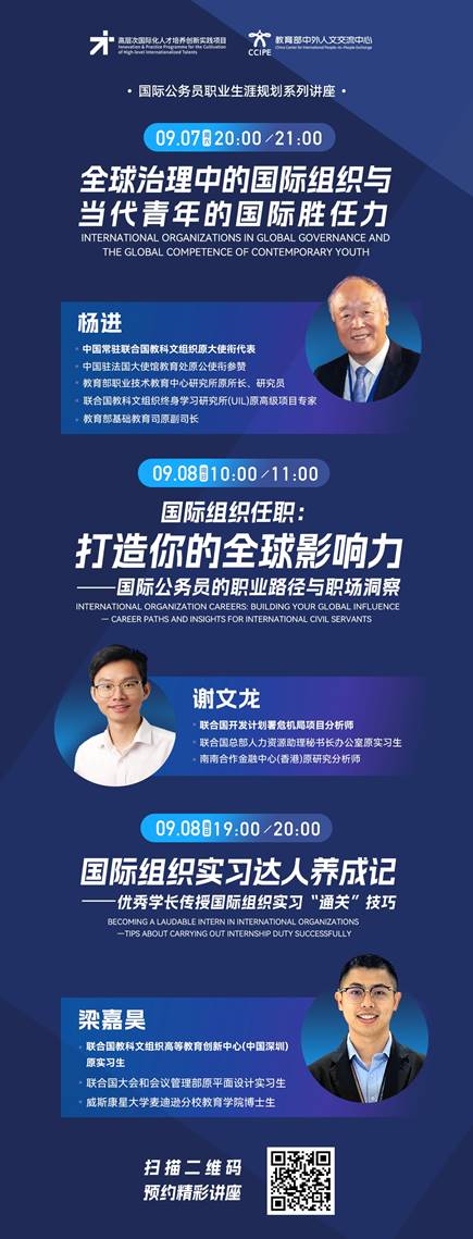 我校于2021年3月正式获批教育部中外人文交流中心“高层次国际化人才培养创新实践项目”基地建设单位。高层次国际化人才培养创新实践项目定期举办国际公务员职业生涯规划系列讲座,旨在帮助青年学子加深对国际组织的认识和了解,提升参与全球治理的能力和素养。2024年秋季学期国际公务员职业生涯规划讲座将于9月7-8日开启。本期讲座邀请了在联合国教科文组织、联合国开发计划署等重要国际组织拥有丰富任职经历与外交外事经验的资...