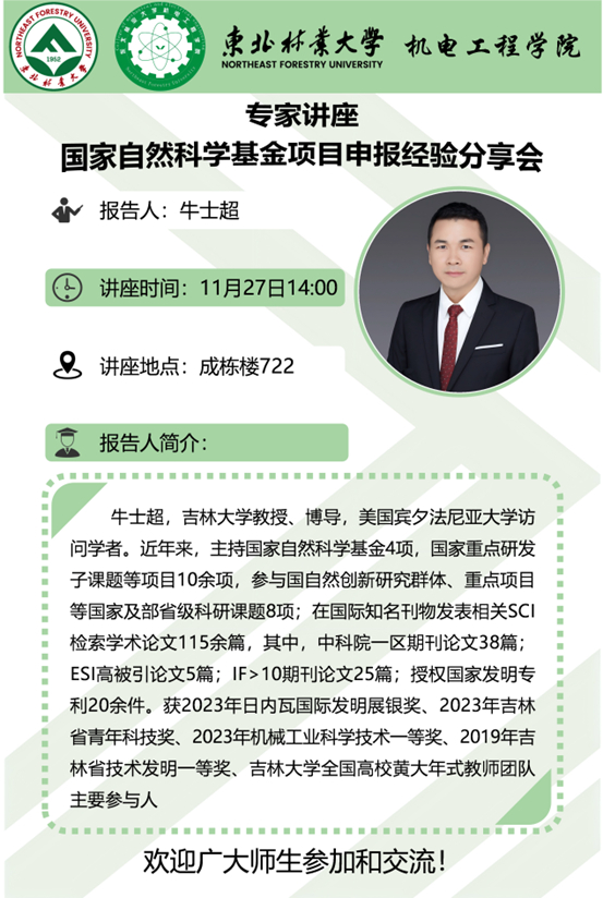 报告题目:国家自然科学基金项目申报经验分享会报告时间:11月27日14:00报告地点:成栋楼722报告人:牛士超教授报告人简介:牛士超,吉林大学教授、博导,美国宾夕法尼亚大学访问学者。近年来,主持国家自然科学基金4项,国家重点研发子课题等项目10余项,参与国自然创新研究群体、重点项等国家及部省级科研课题8项;在国际知名刊物发表相关SC检索学术论文115余篇,其中,中科院一区期刊论文38篇;ESI高被引论文5篇;IF>10期刊论文...