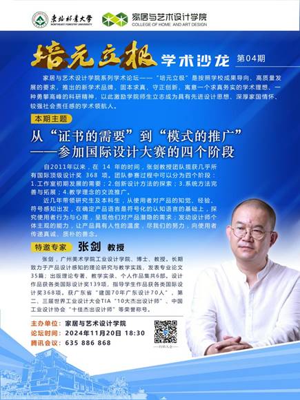 家居与艺术设计学院系列学术论坛——“培元立极”是按照学校成果导向、高质量发展的要求,推出的新学术品牌,固本求真,守正创新,寓意一个求真务实的学术理想、一种勇攀高峰的科研精神,以此激励学院师生立志成为具有先进设计思想、深厚家国情怀、较强社会责任感的学术领航人。本期主题:从“证书的需要”到“模式的推广” ——参加国际设计大赛的四个阶段邀请专家:张剑教授主办单位:家居与艺术设计学院论坛时间:2024年11月...
