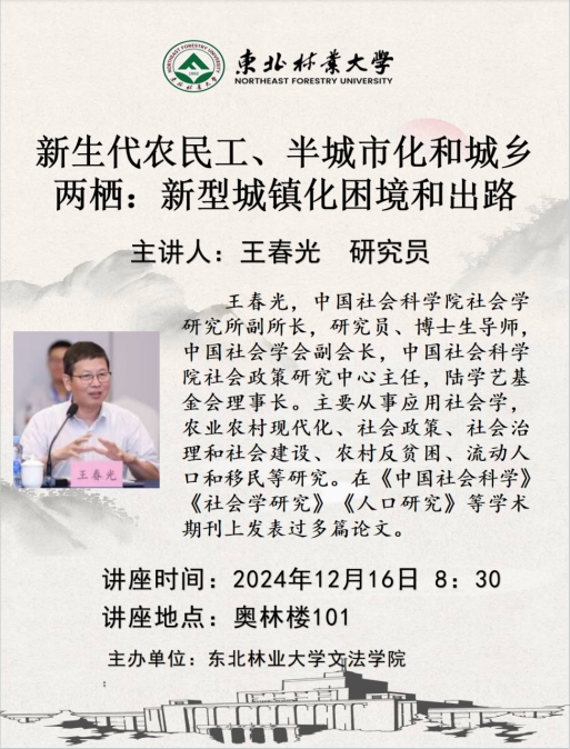讲座题目:新生代农民工、半城市化和城乡两栖:新型城镇化困境和出路主讲人:王春光 研究员 中国社会科学院社会学研究所副所长,研究员、博士生导师,中国社会学会副会长,中国社会科学院社会政策研究中心主任,陆学艺基金会理事长。主要从事应用社会学,农业农村现代化、社会政策、社会治理和社会建设、农村反贫困、流动人口和移民等研究。在《中国社会科学》《社会学研究》《人口研究》等学术期刊上发表过多篇论文。 讲座时...