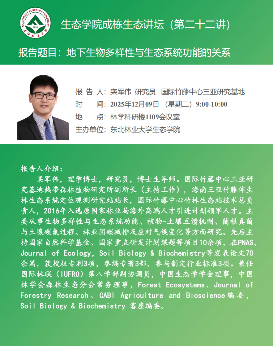 报告题目:后房地产时代木业企业的创新发展与机会报告人:韩建超报告时间:2025年12月5日9:00地点:材料楼301会议室个人简介:韩建超,高级工程师,江苏福庆集团研究院院长,中国木材保护工业协会专家委员、国家林草局木材节约利用创新联盟理事会理事。星空游戏免费版下载木材科学与工程专业2005级本科生,毕业后加入福庆集团,从基层逐步晋升,在集团的研发和管理体系中发挥重要作用,推动企业在木材加工领域的技术创新与发展。主要...