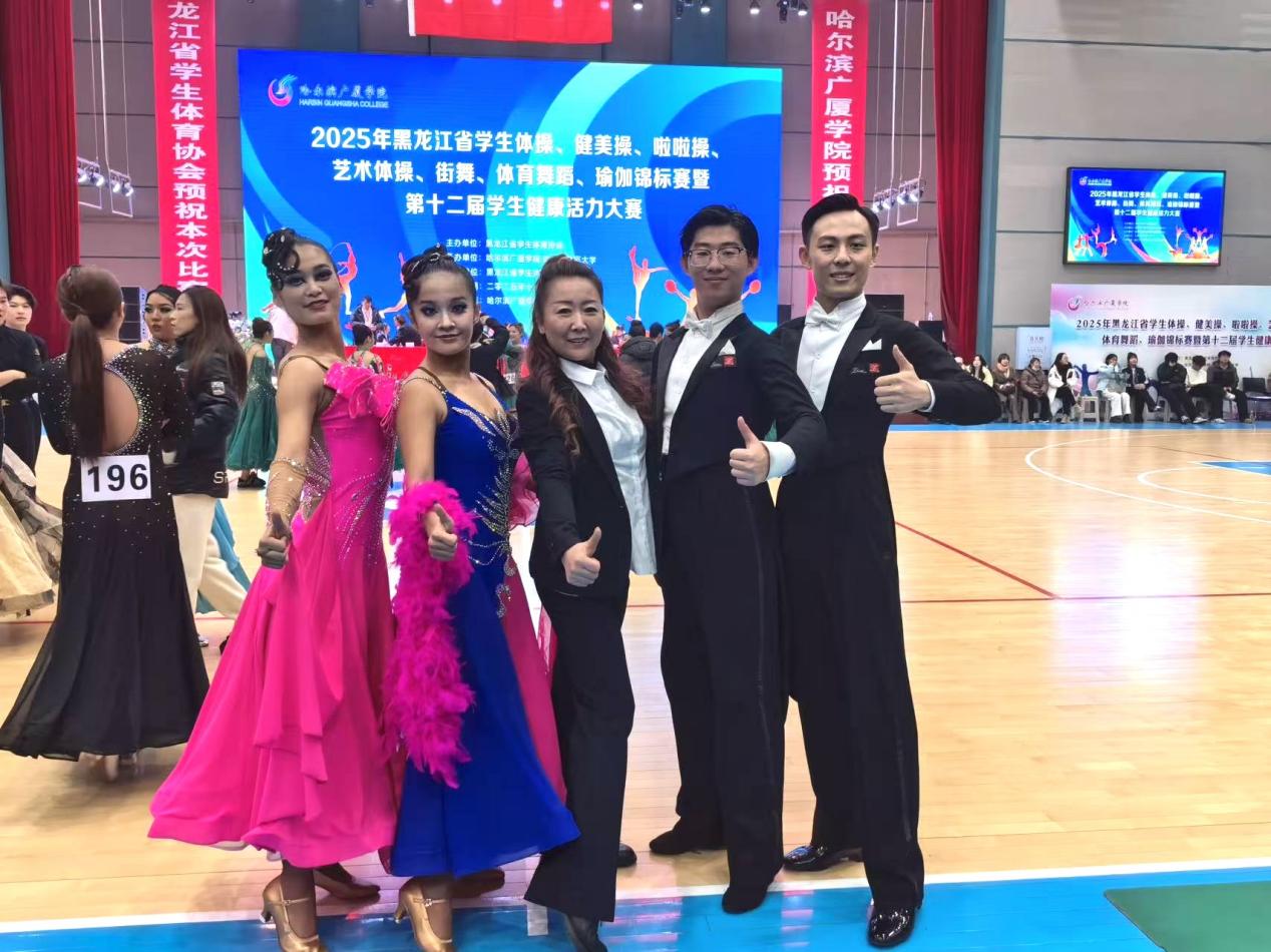11月8日至9日,由黑龙江省教育厅、黑龙江省学生体育协会主办的黑龙江省第十二届学生健康活力大赛在哈尔滨广厦学院举办。我校由体育部主任关大鹏领队、曹春燕担任教练员的体育舞蹈队,凭借精湛的技艺、优雅的风范和顽强的拼搏精神,在比赛中脱颖而出,一举夺得13项冠军,并共计收获43项奖励,曹春燕获得“优秀教练员”称号。在强手如林的赛场上,我校体育舞蹈队的队员们用热情奔放的拉丁舞姿和优雅标准的摩登舞步,征服了现场的...