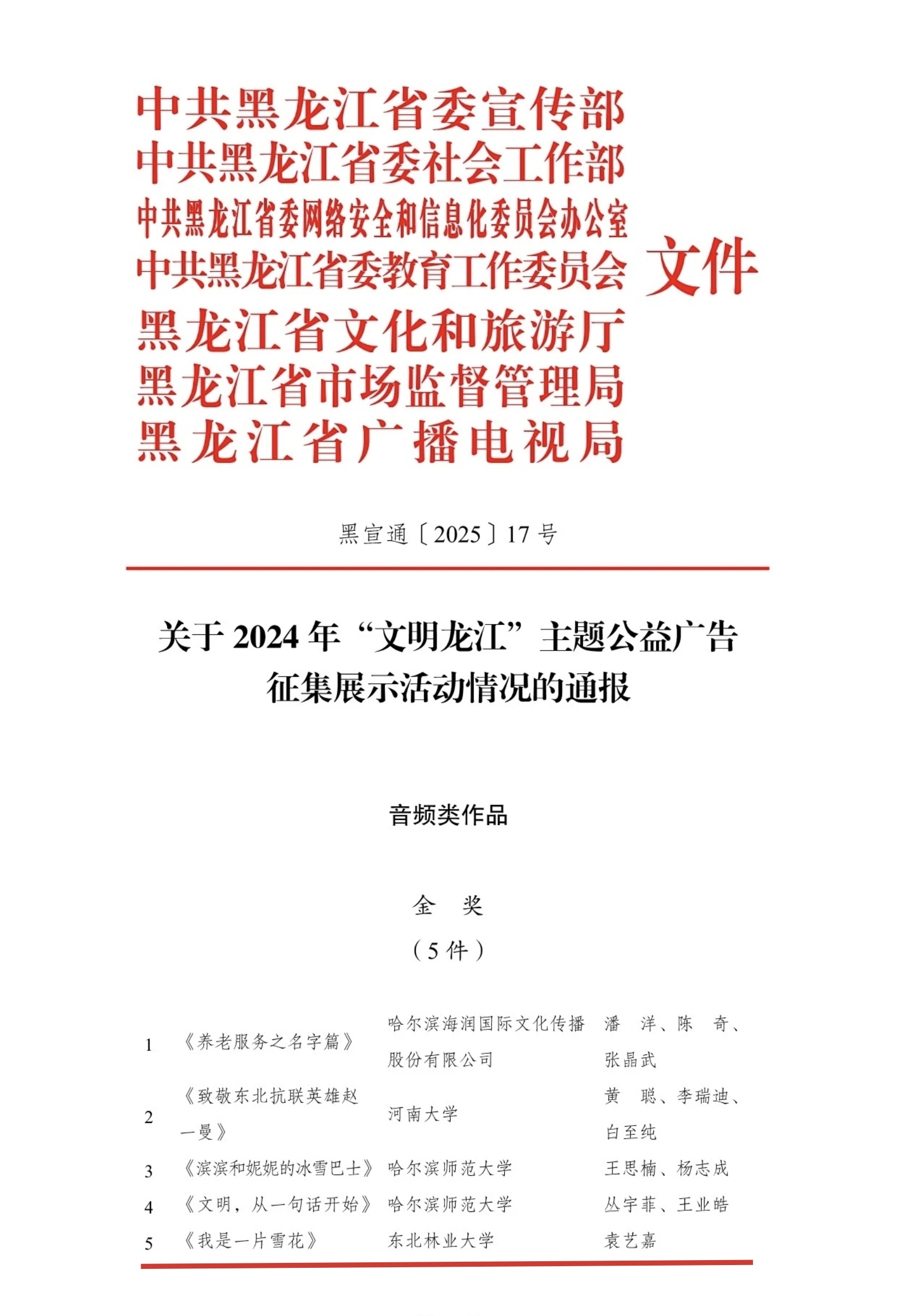 近日,由中共黑龙江省委宣传部联合省委社会工作部、省委网信办、省委教育工委、省文旅厅、省市场监管局、省广电局共同举办的2024年“文明龙江”主题公益广告征集展示活动落下帷幕。我校在本次大赛中表现突出,共斩获金奖1项、优秀奖2项,两位老师获评优秀指导教师,学校荣获优秀组织单位。由文法学院广告学专业学生袁艺嘉创作、黄薇副教授指导的音频作品《我是一片雪花》,凭借其独特的创意和深刻的主题表达荣获金奖。该作品以...