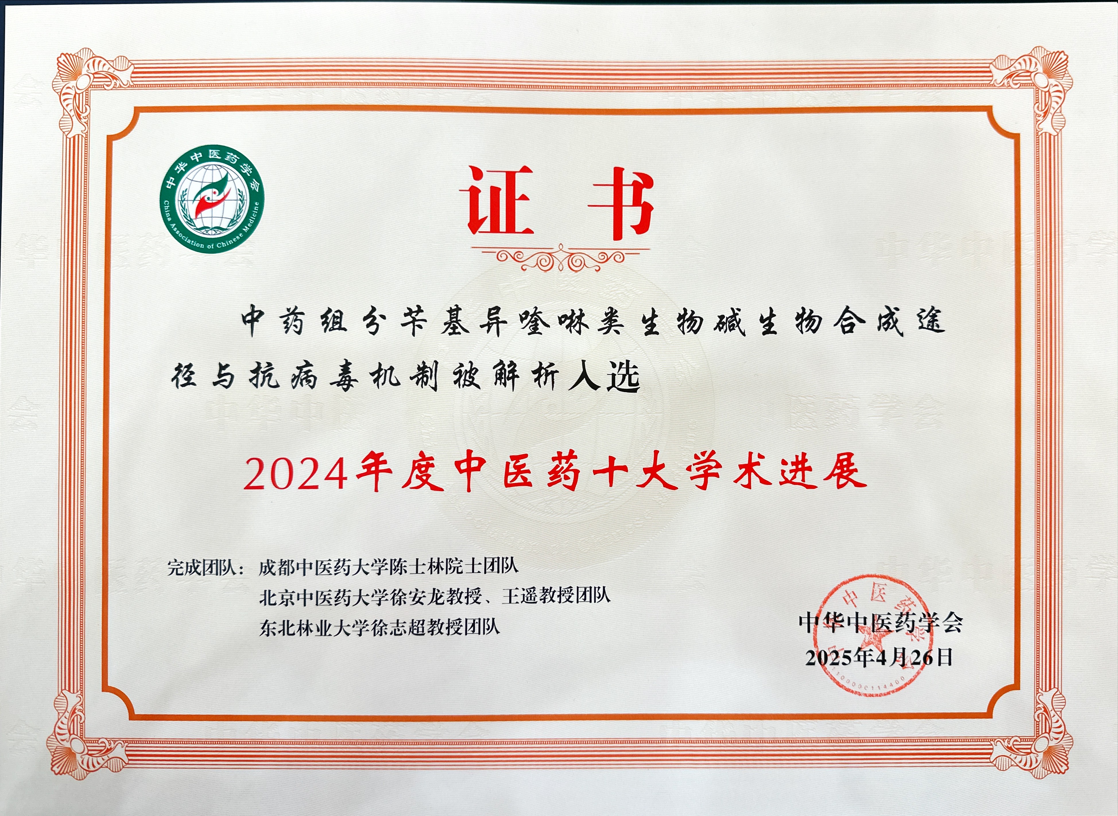 4月26日,中华中医药学会在京发布了2024年度中医药十大学术进展。我校生命科学学院徐志超教授团队与成都中医药大学陈士林院士团队、北京中医药大学徐安龙教授/王遥团队合作的研究成果“中药组分苄基异喹啉类生物碱生物合成途径与抗病毒机制被解析”入选。