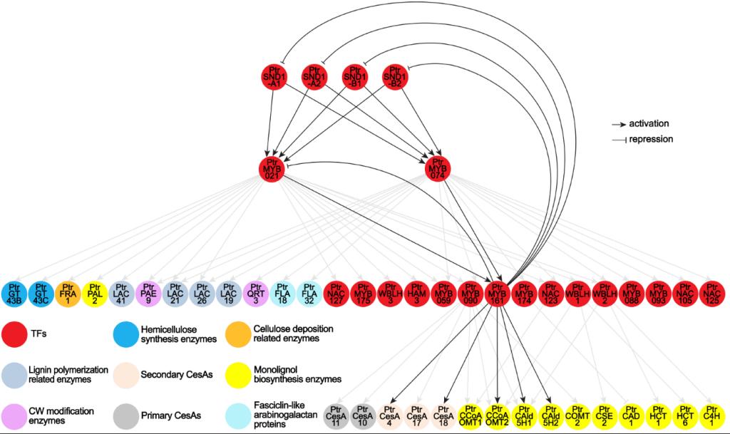 木材形成是一个复杂的发育过程,受到不同水平的分子网络调控。在本团队的前期研究结果中,揭示了木材形成中关键转录因子PtrSND1-B1介导的基因转录调控网络(Lin et al 2013,Plant Cell),并在此基础上进一步构建PtrSND1-B1介导的木材形成多层级基因调控网络,发现木材形成过程存在转录因子-DNA互作和蛋白-蛋白互作共同决定的稳态调控机制,其中PtrMYB161位于该网络的第三层,直接结合并激活5个木材组分合成酶基因的表达(Chen et al 2019,Plant Cell)。