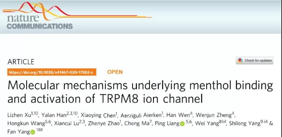 2020年7月29日,浙江大学基础医学院生物物理学系的杨帆课题组、杨巍课题组和星空游戏免费版下载的杨仕隆课题组在《Nature Communications》上发表研究论文“Molecular mechanisms underlying menthol binding and activation of TRPM8 ion channel”,探讨了薄荷醇结合并激活TRPM8受体的结构机理。