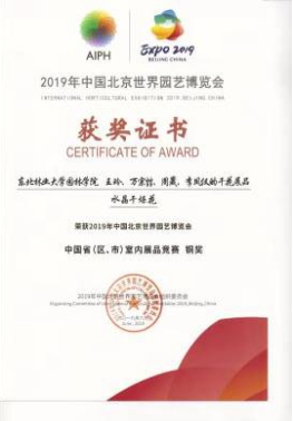 北京世园会国际竞赛组织委员会组织院校、企业,根据《2019北京世园会省区市室内展品评审办法》,对 31个省(自治区、直辖市)室内展品进行了评审。本课题组培育的国际登录新品种‘含蓄’和‘婷蝶’获得两项切花银奖;水晶干燥花和‘迷你粉’组合盆栽获得两项铜奖。