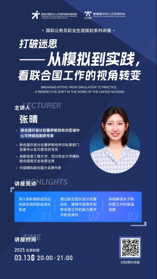 2025年春季学期国际公务员职业生涯规划讲座将于3月12-14日举行。本期讲座邀请了世界卫生组织资深专家、联合国开发计划署在职官员和联合国开发计划署优秀实习生担任主讲人,3位主讲人将围绕国际公务员如何在全球卫生治理体系中发挥关键作用、国际公务员所需的核心能力与职业规划及实习体会、申请技巧等主题展开分享,欢迎同学们积极参加!