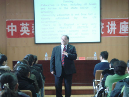 2010年3月16日下午2:00—3:30,外国语学院于学院多功能厅(一教406室)成功举办了“中英教育体系比较”讲座。我院特邀英国伍斯特大学的中国部主任John Nixon教授和学校驻华代表谢源晖教授担任此次讲座的主讲人。此外,参加讲座的嘉宾有外国语学院副院长岳喜华教授、副院长郭永刚教授,学院老师和同学也积极地听取了此次讲座。