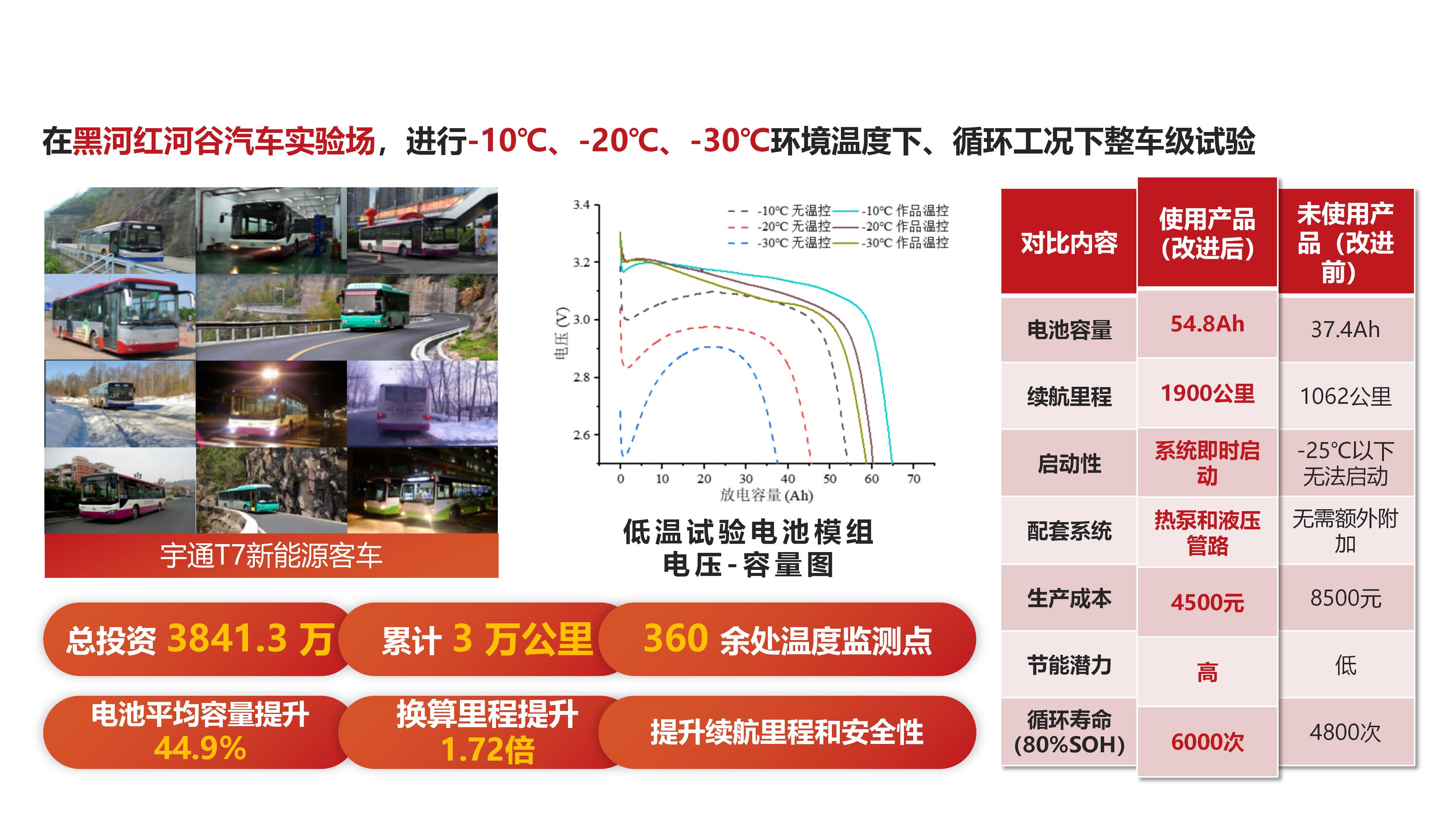本项目所研制的采用纳米流体作为传热工质,利用其双向热传导所研制的热管理系统,对于动力电池组温升控制具有较大的优势,可以实现对动力电池组温度的精确控制,且动力电池组最大温差在1℃之内。(1)在热传导方面,突破了单一传热技术的瓶颈,采用“脉动热管+风冷+加热片”的热管理形式。散热管理期间,利用脉动热管中往复流动的混合纳米流体工质,实现热量从电池模组向外界的传散,有力地提高了散热效率;在加热管理期间,利用脉动热管高导热特性,通过热源加热脉动热管,热量通过脉动热管及均热板以加热动力电池,以达到动力电池模组加热的目的。(2)在电池内核温度估计算法方面,研制的使用联合卡尔曼滤波状态估计算法的电池热管理系统,利用模型估计电池状态,引入实测电池端电压、表面温度进行闭环校正,相较传统电池热管理系统精度大大提高,动力电池组最大误差可控制在1%以内。(3)在电池温控策略方面,采用温控阶梯调控和温度裕度设计:电池温度超过临界温度(如40℃),冷却风扇仅小功率运行,采用能量最优策略。而当动力电池模组温度超过设置的裕度上限后,冷却风扇才会大功率运行,采取温度最优策略,避免强制热管控元件频繁大功率运转,降低系统能耗并延长元件使用寿命。 本产品通过加热与散热技术的有机结合,更好地实现了对电池温度的有效监测与管理,使电池能够工作在理想温度区间内,在提高电池寿命的同时,降低电耗,改善了电池的续航能力,符合节能要求;尤其对于加热的改进使整套系统能够适应北方寒区的低温环境;除此之外,作品设计的智能控制软件能够实现电池温度的即时反馈与自动调节,不需要驾驶员浪费额外的精力,且该软件适应性强,具有普适意义。