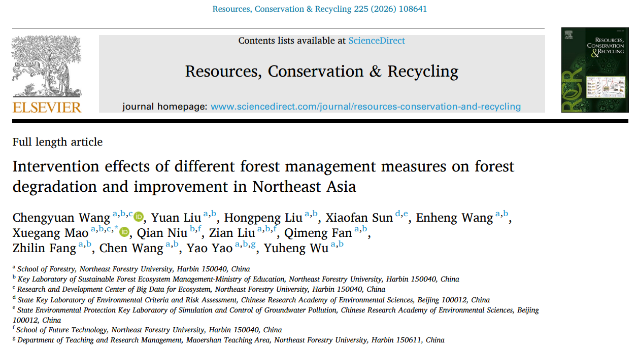 近日,依托森林生态系统可持续经营教育部重点实验室与学校生态系统大数据中心,我校多源遥感数据森林生态系统监测与评价团队在森林管理措施对森林退化与改善影响研究方面取得重要进展。相关成果以“Intervention effects of different forest management measures on forest degradation and improvement in Northeast Asia”为题,发表在资源管理领域国际权威期刊Resources, Conservation & Recycling(中科院一区,五年影响因子12.7)。
