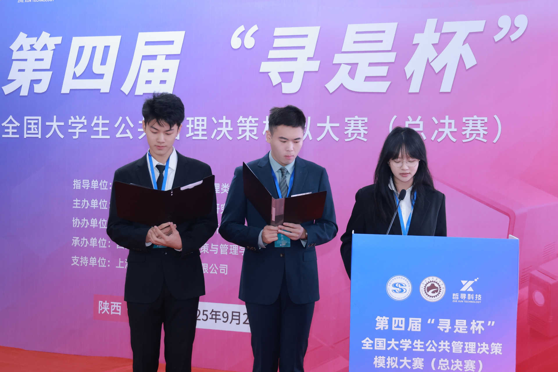 9月19日至21日,第四届“寻是杯”全国大学生公共管理决策模拟大赛(总决赛)在西安交通大学兴庆校区举行。由我校文法学院教师王雪梅、张梦时指导,2023级政治学与行政学专业本科生徐济尘、孙桐和张承毅三名同学组成的代表队,在比赛中荣获特等奖,两位指导老师获评优秀指导教师奖。