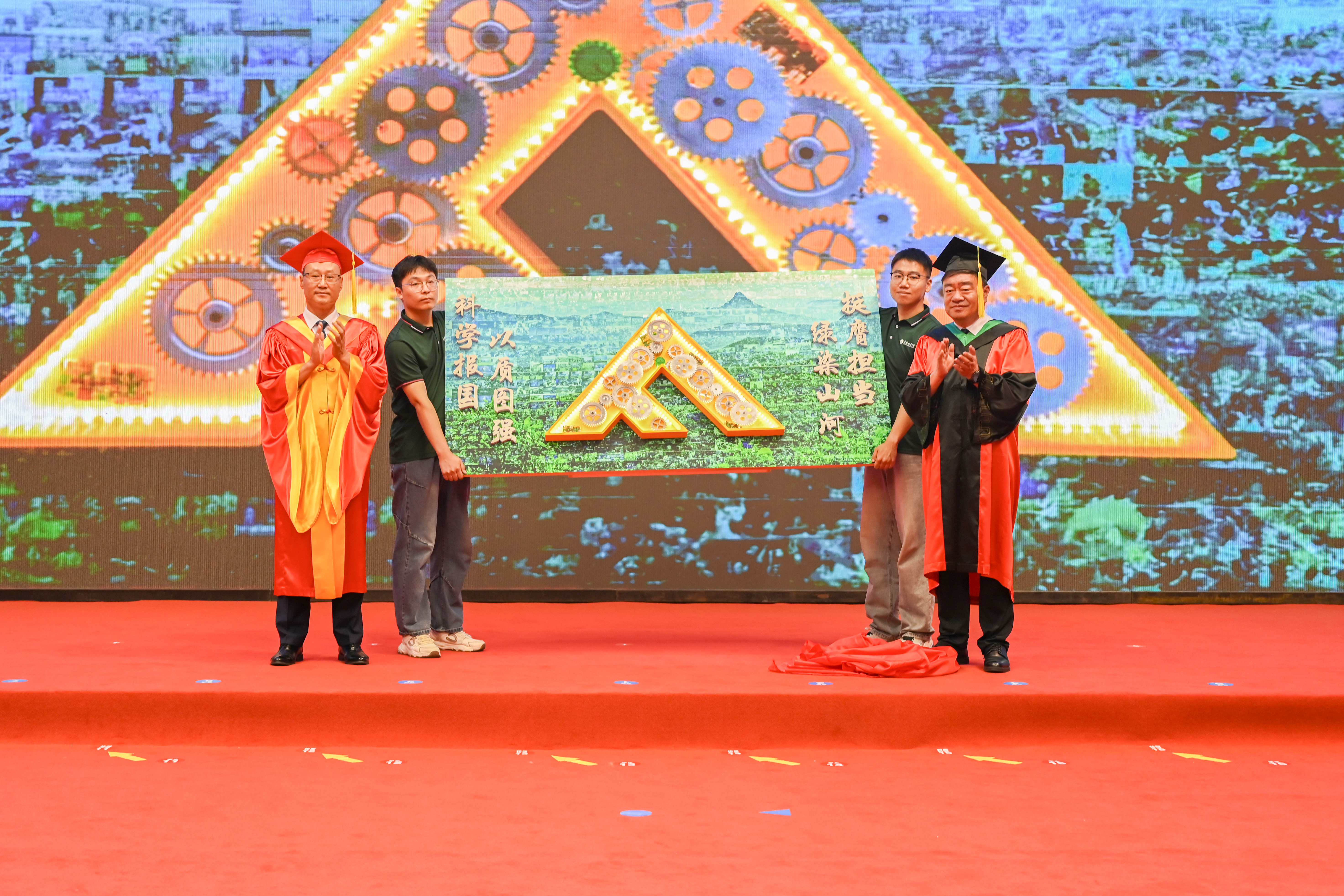 机电工程学院毕业生代表学校2025届全体毕业生,向母校赠送毕业礼物,这个礼物是由历届学科竞赛获奖影像和参赛作品的废弃零部件手工拼装成的版画,寓意东林青年以质图强、挺膺担当。党委书记孙猛、校长宋文龙代表学校接受礼物。