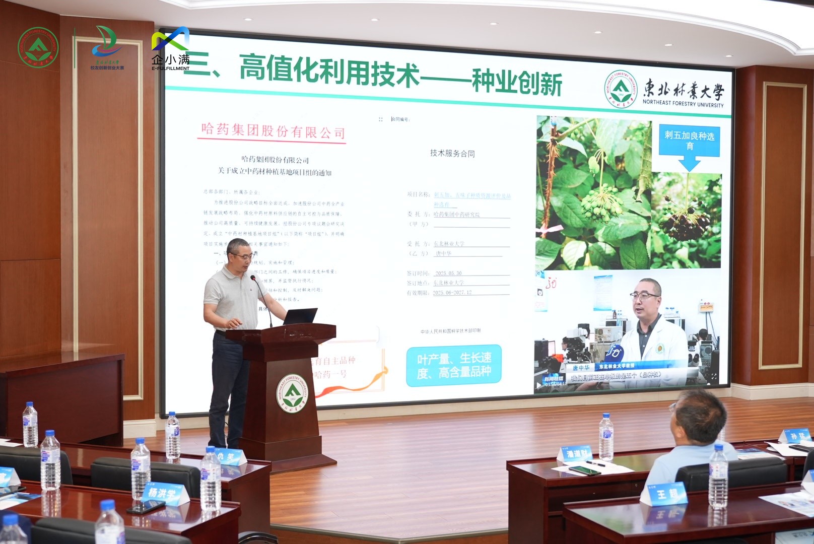 活动现场,哈尔滨市、牡丹江市、佳木斯市、鸡西市、伊春市、安吉县的相关领导,分享介绍各地的投资环境与招商政策。学校化资学院副院长唐中华介绍学院产学研一体化成果,机电学院副教授、博士生导师陈萌展示教师团队的科技创新项目。