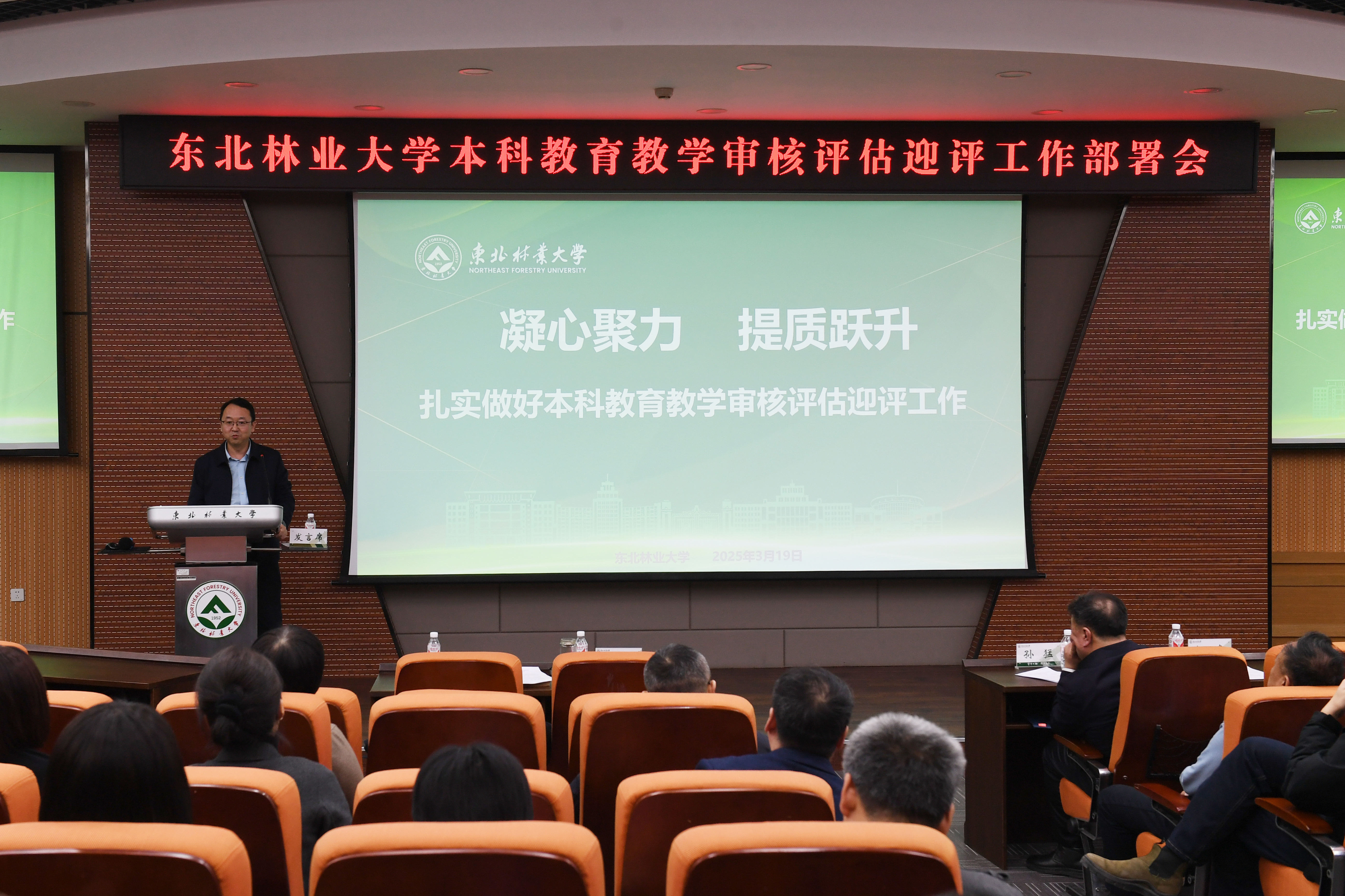 为全力迎接本科教育教学审核评估,进一步确保各项评建工作落到实处、取得实效,2025年3月19日下午,学校在奥林楼101会议室召开本科教育教学审核评估迎评工作部署会。学校党委书记孙猛、副校长李明泽出席会议,哈尔滨工程大学本科生院副院长何建教授应邀作专题经验交流,各职能部门负责人、各学院中层领导干部、本科生院及校评建办全体成员等近200人参加会议。会议由学校党委常委、副校长李明泽主持。