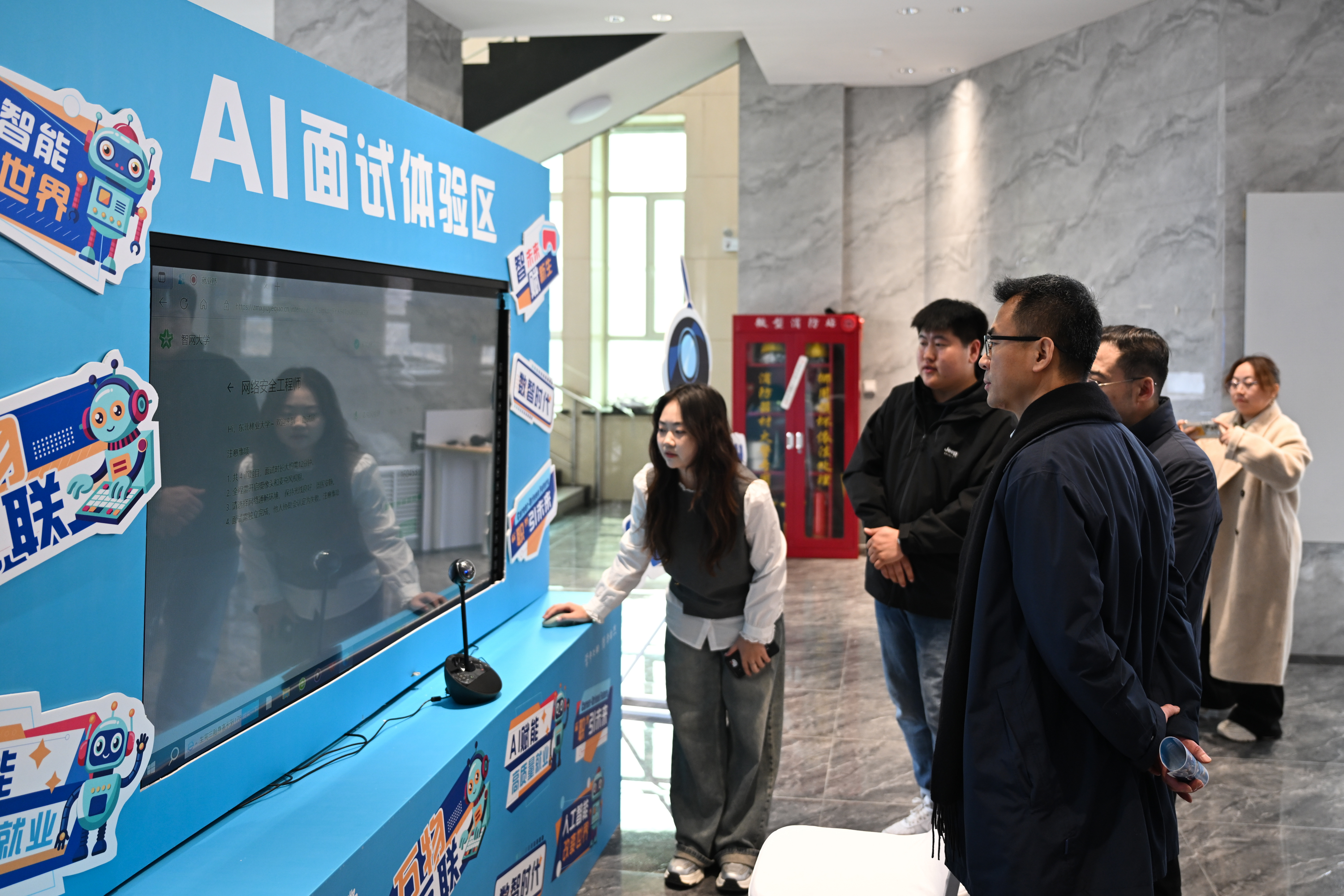 在隔壁的AI面试区,环境模拟系统正根据“应聘者”的简历生成个性化问题。经济管理学院刘欣宇刚刚结束一场“行政助理”模拟面试,系统摄像头同步捕捉她的微表情与肢体语言。“AI面试官指出我在回答‘合作挑战’问题时语速过快,表达模糊。建议我突出重点,可以提供具体例子并强调个人贡献。”刘欣宇表示,这种沉浸式体验让她提前适应了应聘岗位的面试风格。