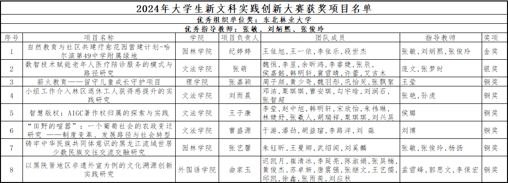 历经校赛选拔、省级复赛,我校共有8支团队入围国赛,其中园林学院《自然教育与社区共建疗愈花园营建计划——哈尔滨第49中学附属绿地》项目喜获金奖,文法学院《数智技术赋能老年人医疗陪诊服务的模式与路径研究》项目获得银奖,理学院《薪火教育——留守儿童成长守护项目》等6个项目获得铜奖;张敏、刘炳熙和张俊玲三位老师获得“优秀指导教师”荣誉称号。