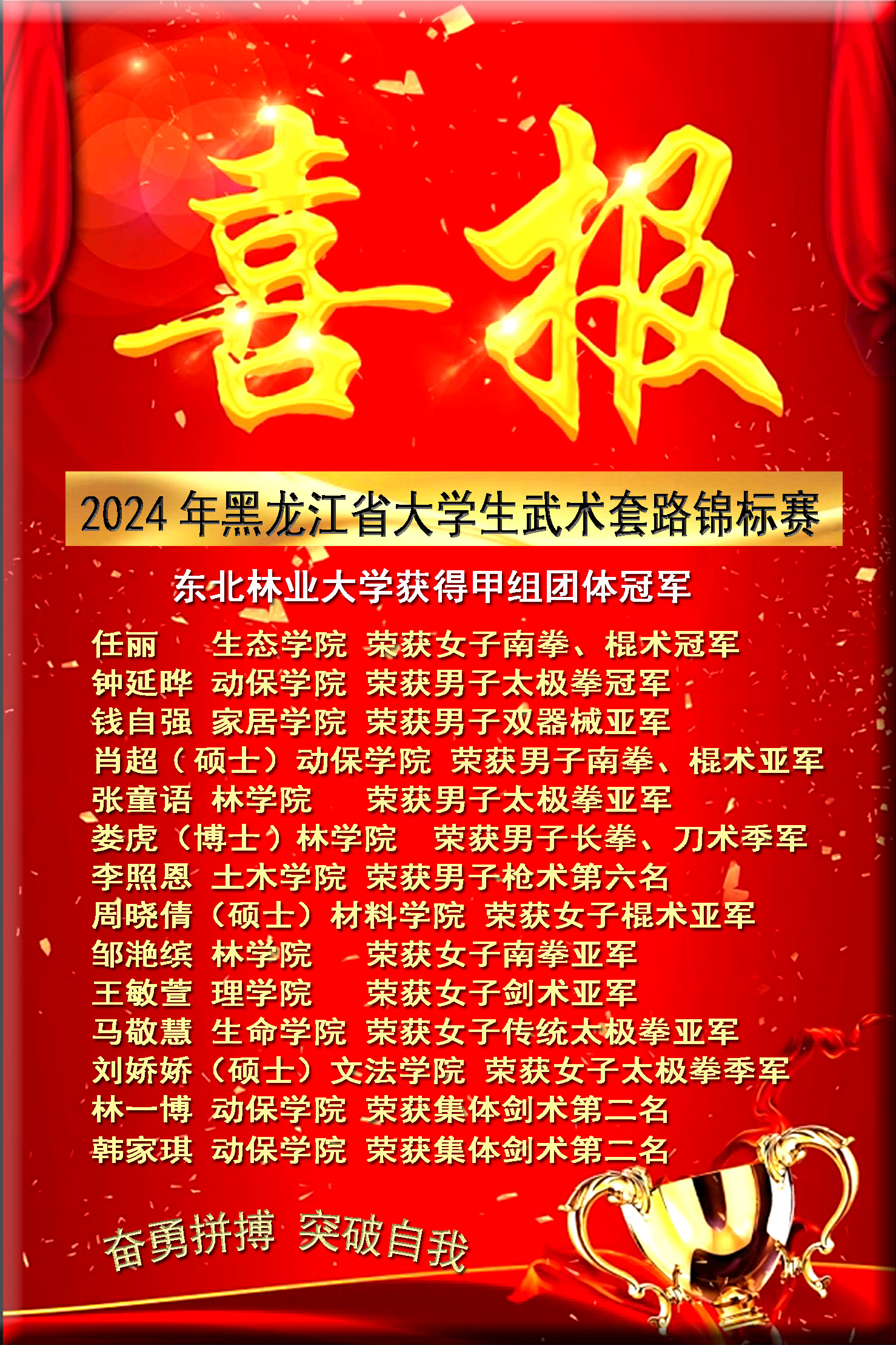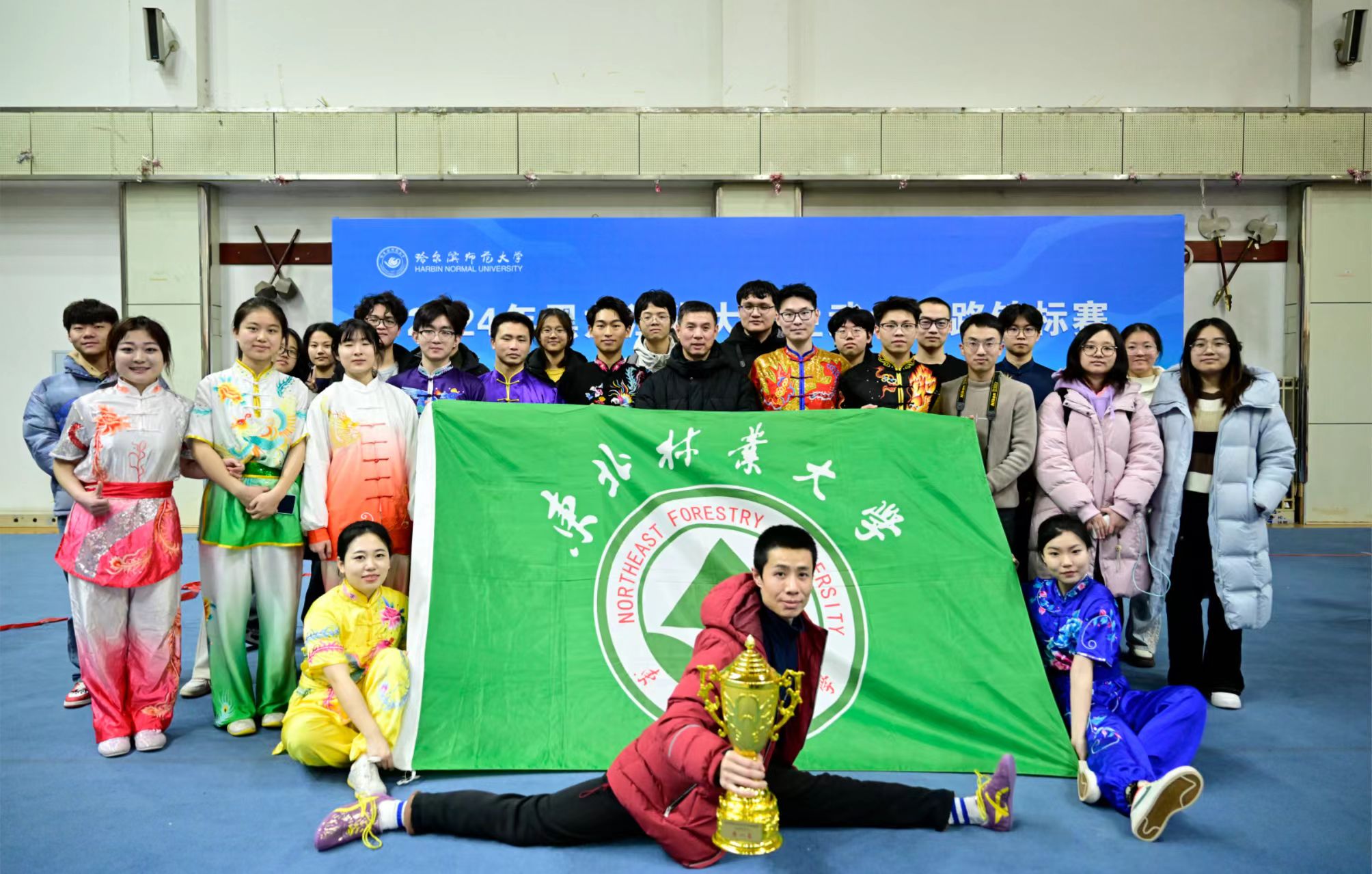 12月15日,黑龙江省大学生武术套路锦标赛在哈尔滨师范大学落下帷幕。来自全省23所院校的254名运动员,围绕35个项目展开激烈角逐。我校选派14名运动员参赛,经过两天的奋勇拼搏,最终收获了3金14银11铜,并以总分227分摘得甲组团体冠军。体育部教师曹立勇获得“优秀教练员”称号;野生动物与自然保护地学院钟延晔同学、生态学院任丽同学获得“优秀运动员”称号。