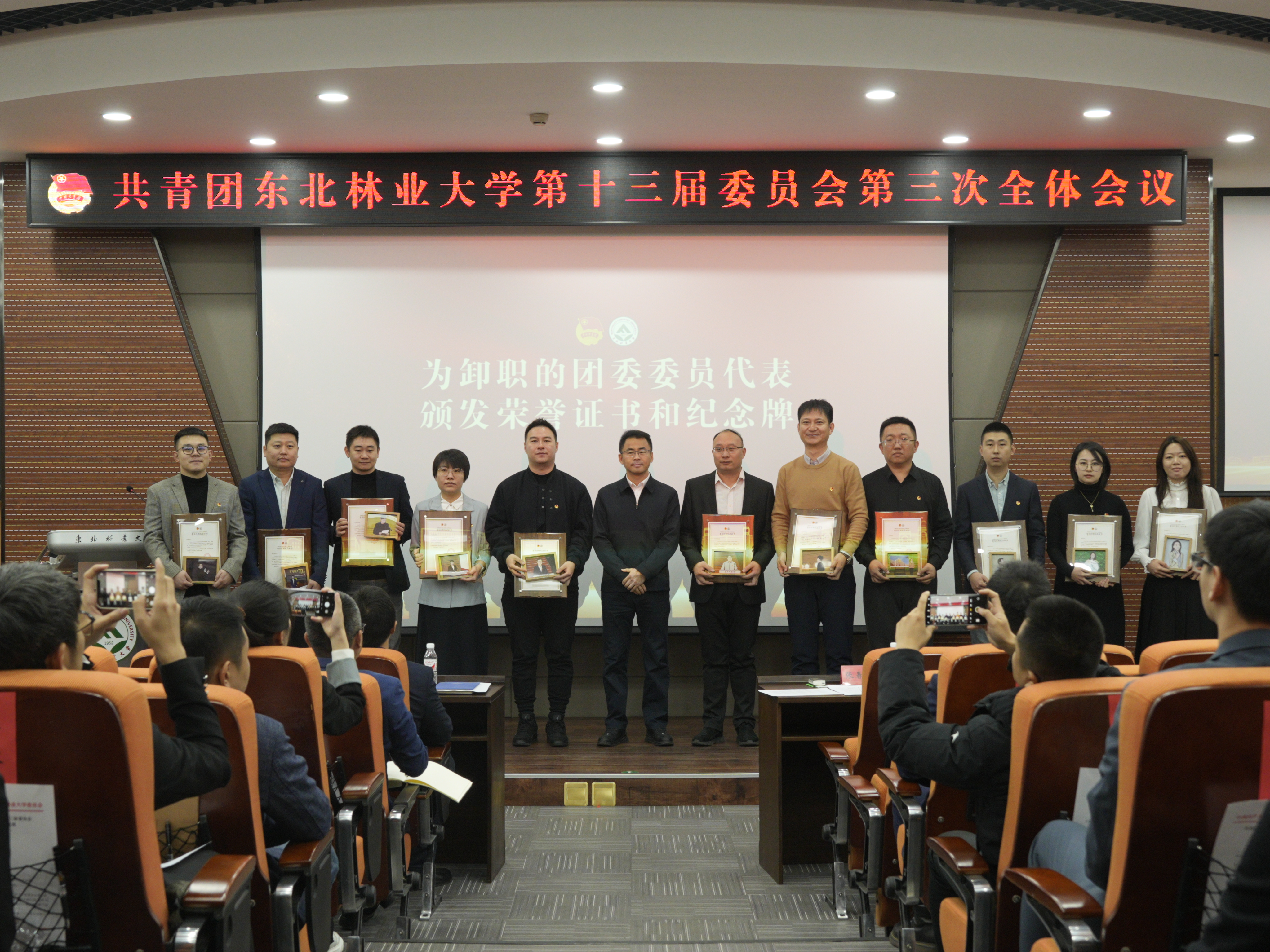 学校领导为卸职的团委委员代表颁发荣誉证书和纪念牌。