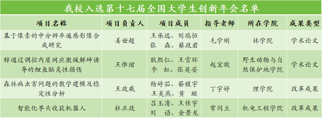 我校推荐7个国创项目参加第十七届全国大学生创新年会,经过层层选拔,最终4个项目入选年会参加展示。林学院姜世超团队的《基于像素的中分辨率遥感影像合成研究》项目借助遥感与地理分析技术,旨在准确阐明中国城市扩张与土地利用类型转变的耦合作用机制;野生动物与自然保护地学院王惟珺团队的《锌通过调控内质网应激缓解砷过量诱导的鲤鱼脑炎性损伤》项目,探讨了亚慢性砷暴露后鲤鱼脑损伤机制,为锌制剂应用于防治和砷污染引起的机体损伤提供依据;理学院王政威团队的《森林病虫害问题的数学建模及稳定性分析》项目建立了若干时微分方程,对延长林木生长周期、未来林区发展、防治森林病虫害工作提供预估与建议;机电工程学院杜正政团队的《智能化芋头收获机器人》项目研发了一款智能芋头收获机,为解决多子芋机械化收获的农业实际难题提供了创新思路。
