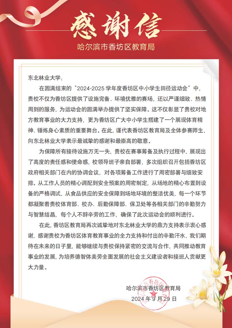 信中提到,我校功能完备的场地设施,严谨细致、热情周到、协调有序的工作作风和服务能力,为2024-2025年度香坊区中小学生田径运动会的成功举办提供了坚实的保障。
