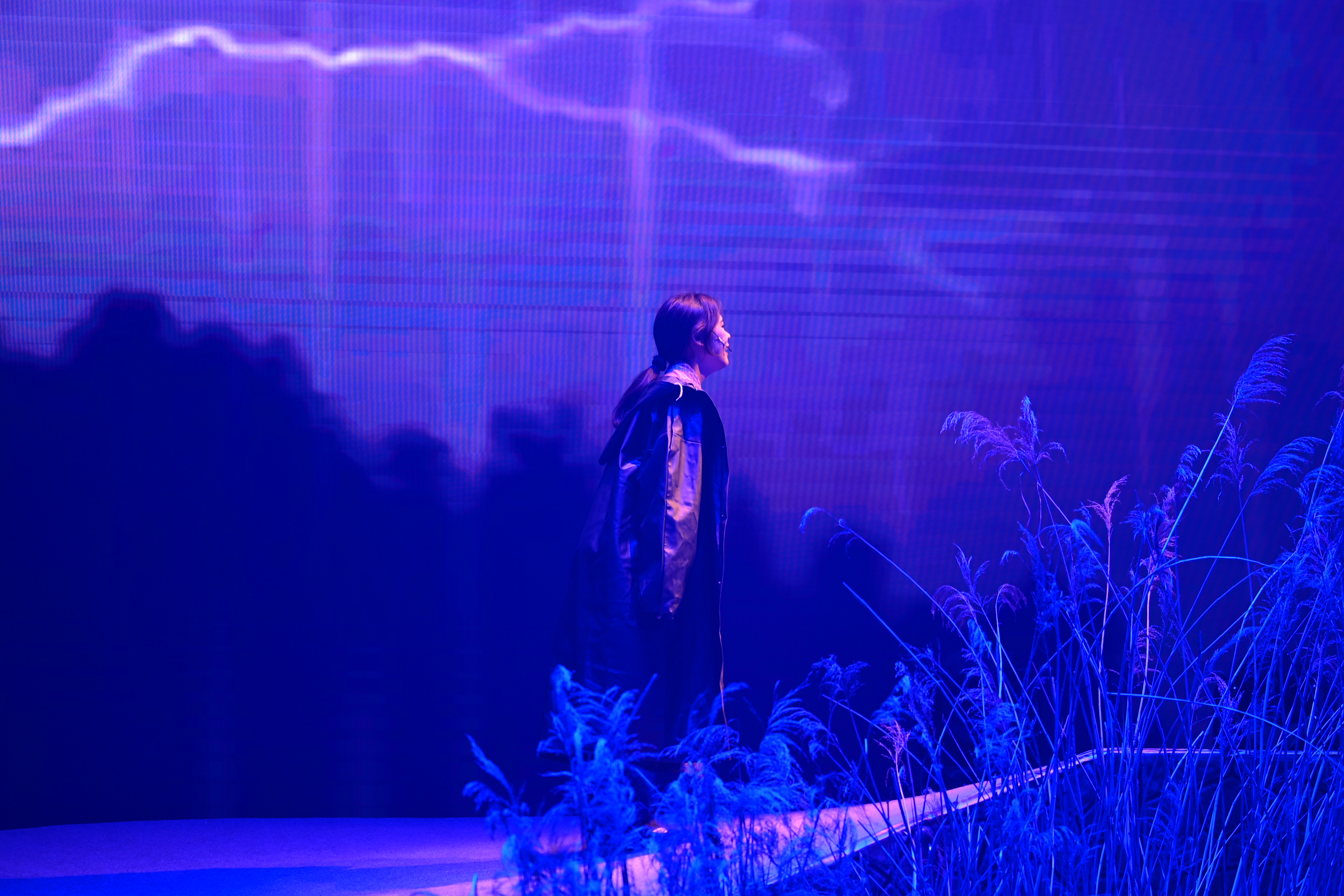 “黎明”“牧仁”的呼喊划破阵阵雷声,随着舞台上一个孤独的身影在雷雨交加的夜晚中艰难前行,演出正式拉开帷幕。泥泞的沼泽沾湿裤脚,天空的闪电若隐若现,一束束灯光映入眼帘、一声声呼唤久久回荡,这片芦苇荡让在场观众身临其境、沉浸其中。