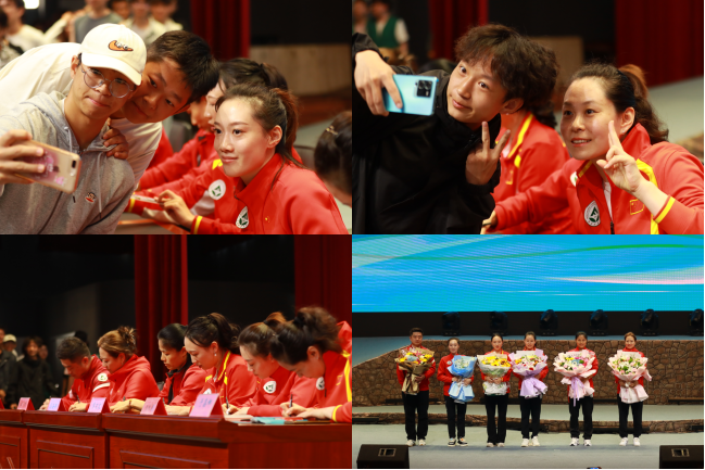 学生代表以献花的方式表达对冠军们的敬意,冠军们与观众亲切交流、合影,并为大家送上亲笔签名照片。