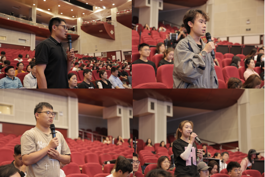 “在遇到困难或瓶颈时,如何保持乐观心态继续前行”“‘兔子战术’的成功秘诀是什么”“体育运动会给自己带来哪些变化和影响”……在互动环节,师生们争相举手提问,冠军们耐心细致地一一解答。随后,主持人随机挑选现场20余名同学走上舞台,冠军们围绕短道速滑姿态、花滑转体技巧、摔跤动作规范等方面,现场演示教学。