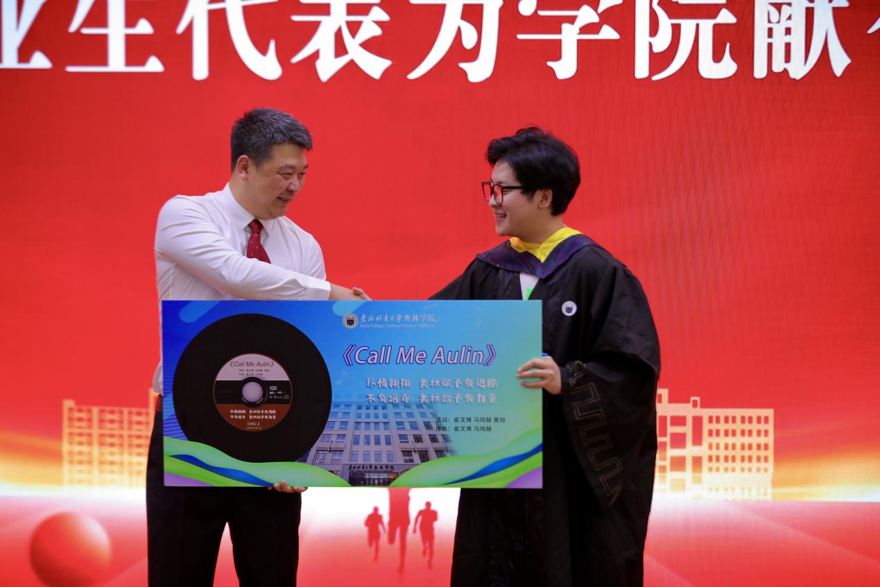 毕业生代表崔文博以原创歌曲《Call Me Aulin》向学院献礼,祝福同学们未来一切顺利,日后再次相约奥林。