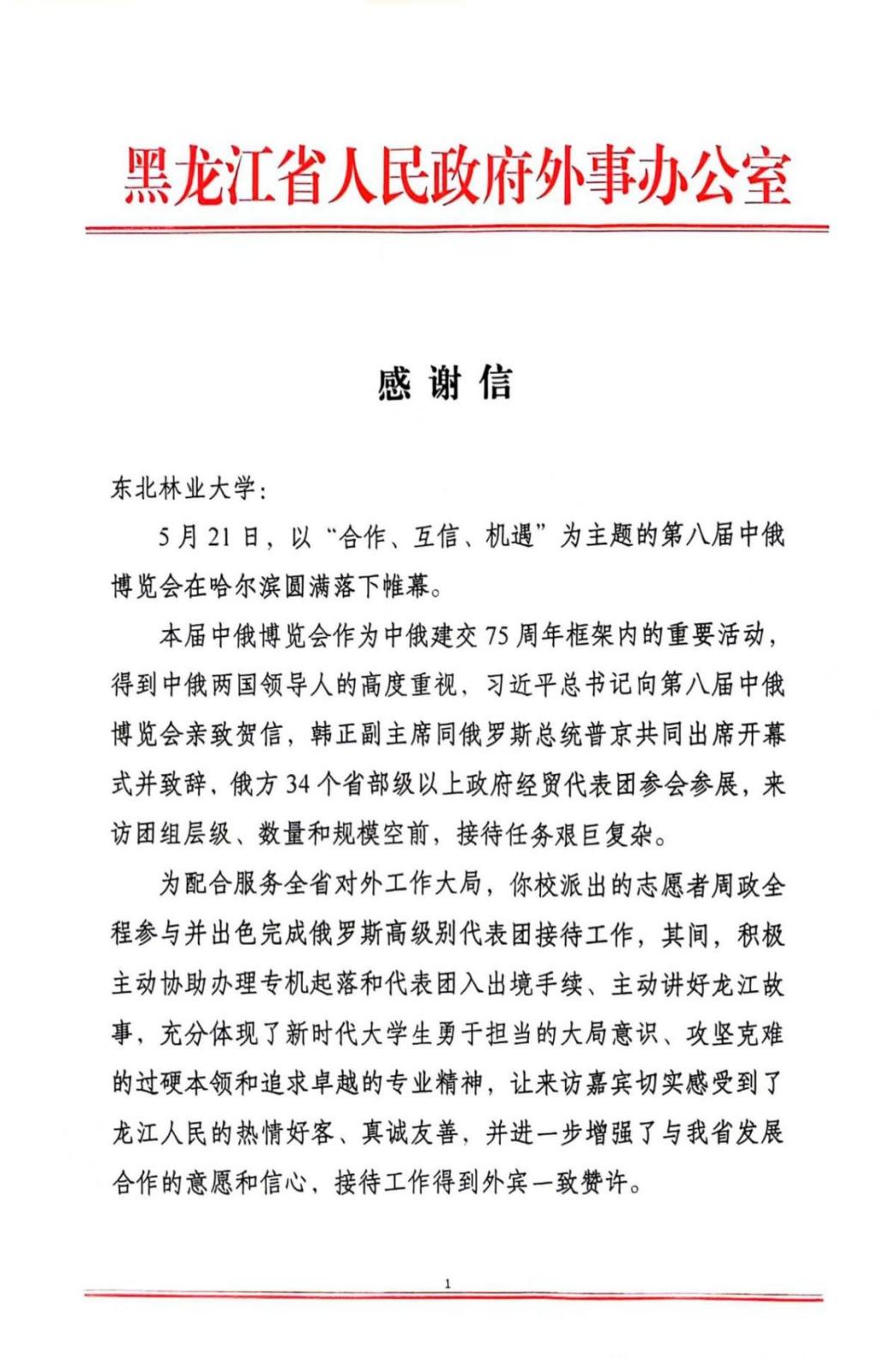 近日,我校收到黑龙江省人民政府外事办给我校发来的感谢信,感谢我校学子在第八届中俄博览会期间的优秀表现。