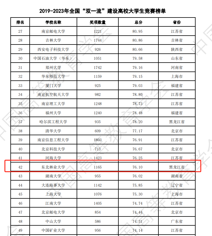 3月22日,中国高等教育学会高校竞赛评估与管理体系研究专家工作组发布《2023全国普通高校大学生竞赛分析报告》。我校在《2019~2023年全国农林类本科院校大学生竞赛榜单(TOP20)》中,以总分76.1(获奖1165项)的成绩再次位居第一,连续六年蝉联榜首。我校在《2023年全国普通高校大学生竞赛榜单(本科,TOP100)》中位居41位。在《2019~2023年全国“双一流”建设高校大学生竞赛榜单》中位居42位。