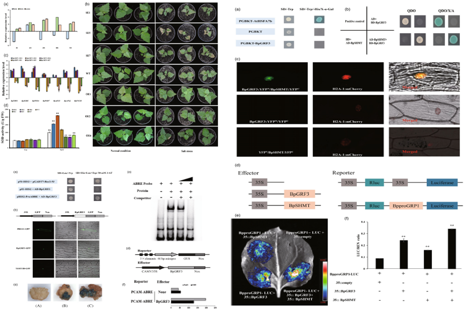 研究团队以我国北方珍贵树种白桦(Betula platyphylla)为研究对象,在证实BpGRP1(富含甘氨酸的RNA结合蛋白基因)显著增强白桦耐盐能力的基础上,通过Y1H、EMSA、白桦体内GUS染色及ChIP-PCR等手段证实白桦BpGRF3结合ABRE元件,调控BpGRP1的表达。进一步利用遗传学及分子生物学手段,首次证实在白桦体内BpGRF3与BpSHMT互作,正调控BpGRP1的表达,增强白桦对盐胁迫的耐受能力。除此之外,该研究还证实,BpmiR396c能够通过切割BpGRF3,抑制BpGRF3转录,负调控盐胁迫应答。由此,解析了白桦BpmiR396c/BpGRF3调控模块介导BpGRP1表达,参与白桦体内氧化还原、质膜损伤等生理途径,调节白桦响应盐胁迫的调控机制。