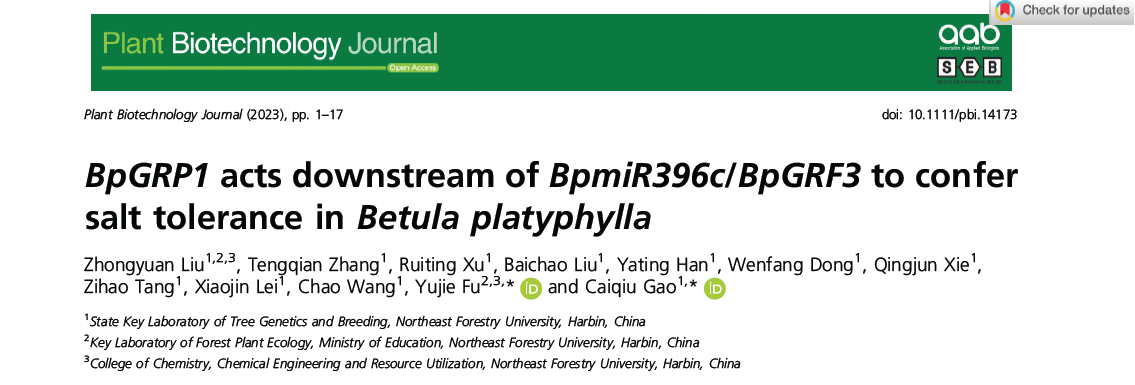 近日,我校林木遗传育种全国重点实验室高彩球教授团队和森林植物生态学教育部重点实验室付玉杰教授研究团队在国际植物学权威期刊Plant Biotechnology Journal(中科院大类一区,IF=13.2)上发表了题为“BpGRP1 acts downstream of BpmiR396c/BpGRF3to confer salt tolerance in Betula platyphylla”的研究论文。该研究解析白桦BpmiR396c/BpGRF3/BpGRP1响应盐胁迫的多层级调控机制同时,创制出多个耐盐能力增强的白桦新种质,为后续有效利用和开发盐渍土地,扩大白桦的可栽植范围奠定基础。