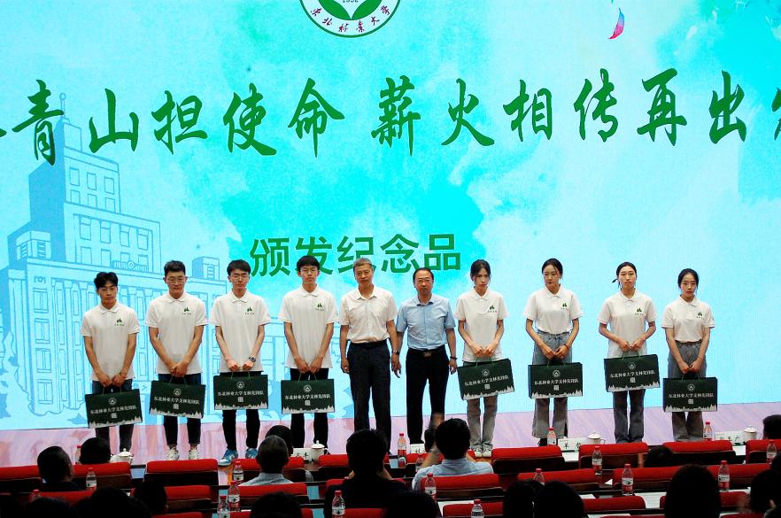 黑龙江省林业和草原局人事处副处长马天红和大兴安岭林业集团公司人力资源开发处副处长李庆峰为首届支林学生代表颁发纪念礼物。