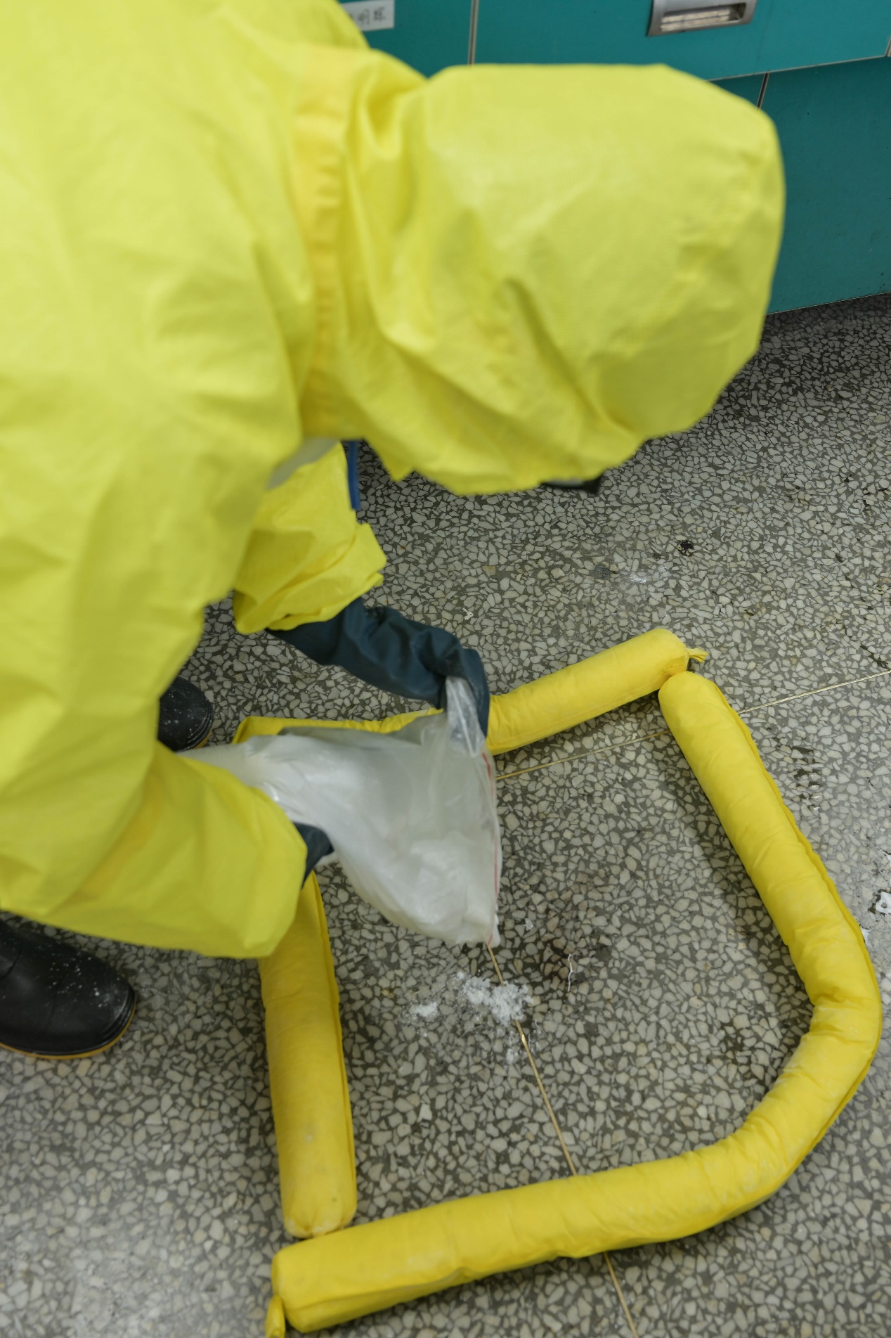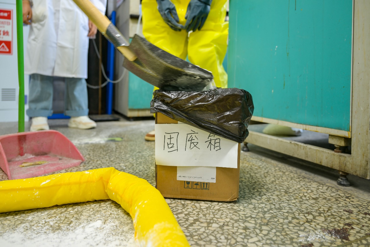 一名同学不小心将盐酸瓶打翻在地,该同学立刻脱下手套和实验服,检查身上是否有盐酸喷溅。旁边两名同学迅速到走廊应急器材柜取出防护套装穿上,其他两位同学取吸附带、消防铁固废收集箱和生石灰。把吸附带围在盐酸泄露处、在打翻的盐酸上面均匀覆盖生石灰、用消防铁锹将固体粉末收集起来放入固废收集箱内……短短几分钟内,小组内同学按照规范步骤完成泄漏液体的收集及无害化处理。