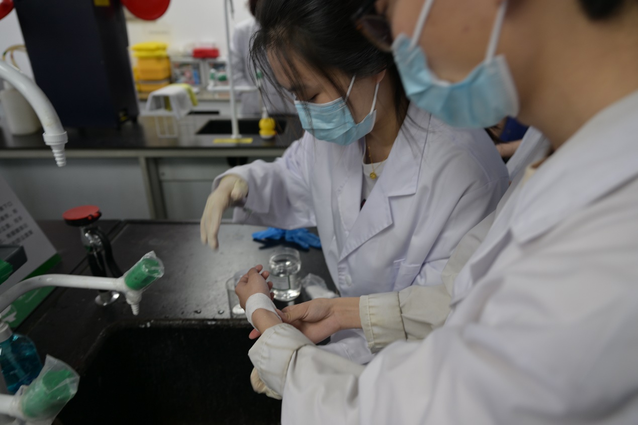 “快点,我的胳膊被灼伤了!”实验室另一边,一位同学在实验过程中,不慎将碱性液体滴洒到了皮肤上,旁边的同学赶紧拿来纱布上前帮忙擦拭。随后,被灼伤的同学用清水冲洗,同时还用PH试纸不断测定创面的酸碱度……