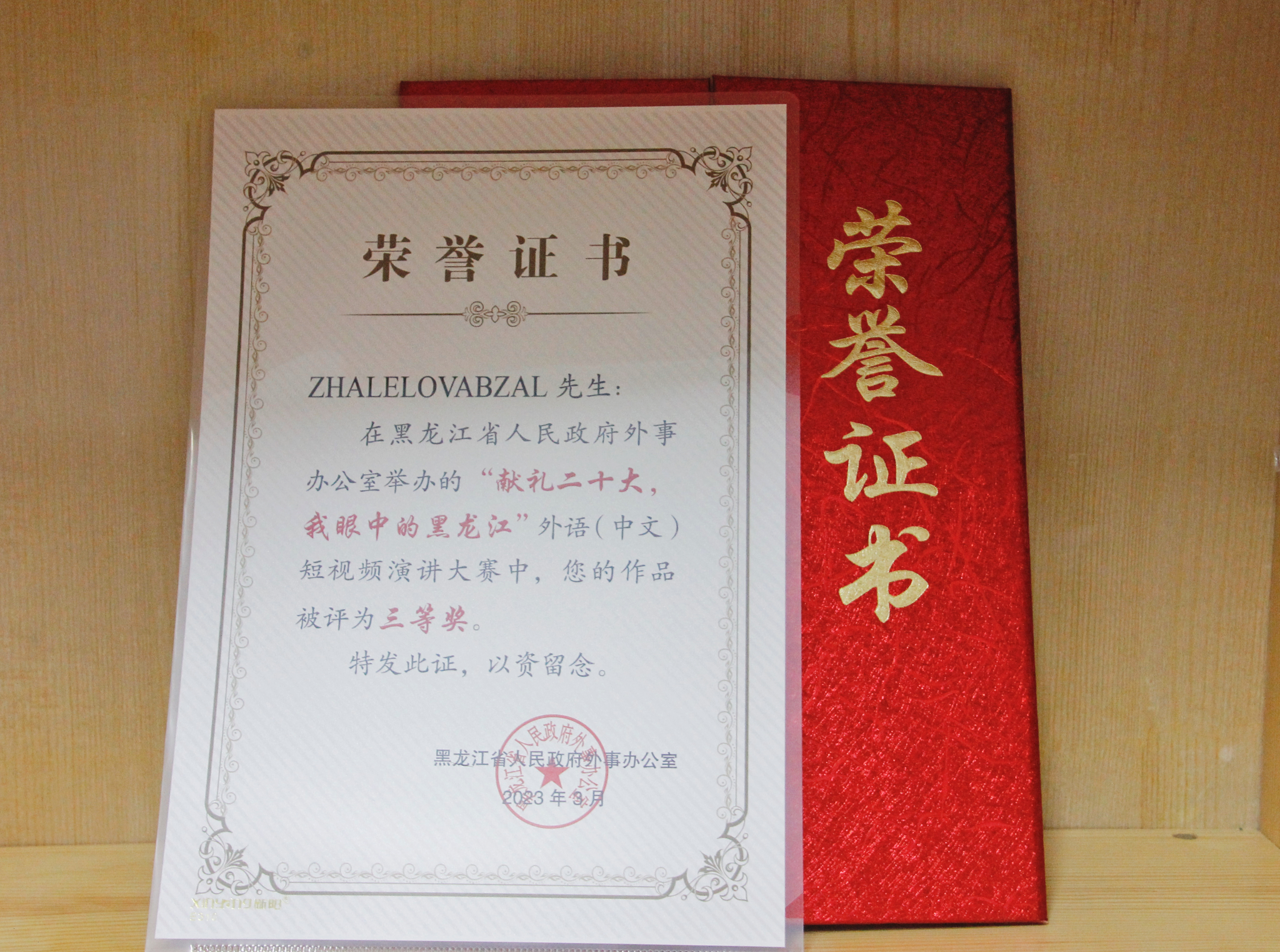 近日,由黑龙江省人民政府外事办公室举办的“献礼二十大,我眼中的黑龙江”外语(中文)短视频演讲大赛获奖结果公布,我校哈萨克斯坦籍留学生阿布扎尔(ZHALELOV ABZAL)荣获三等奖。