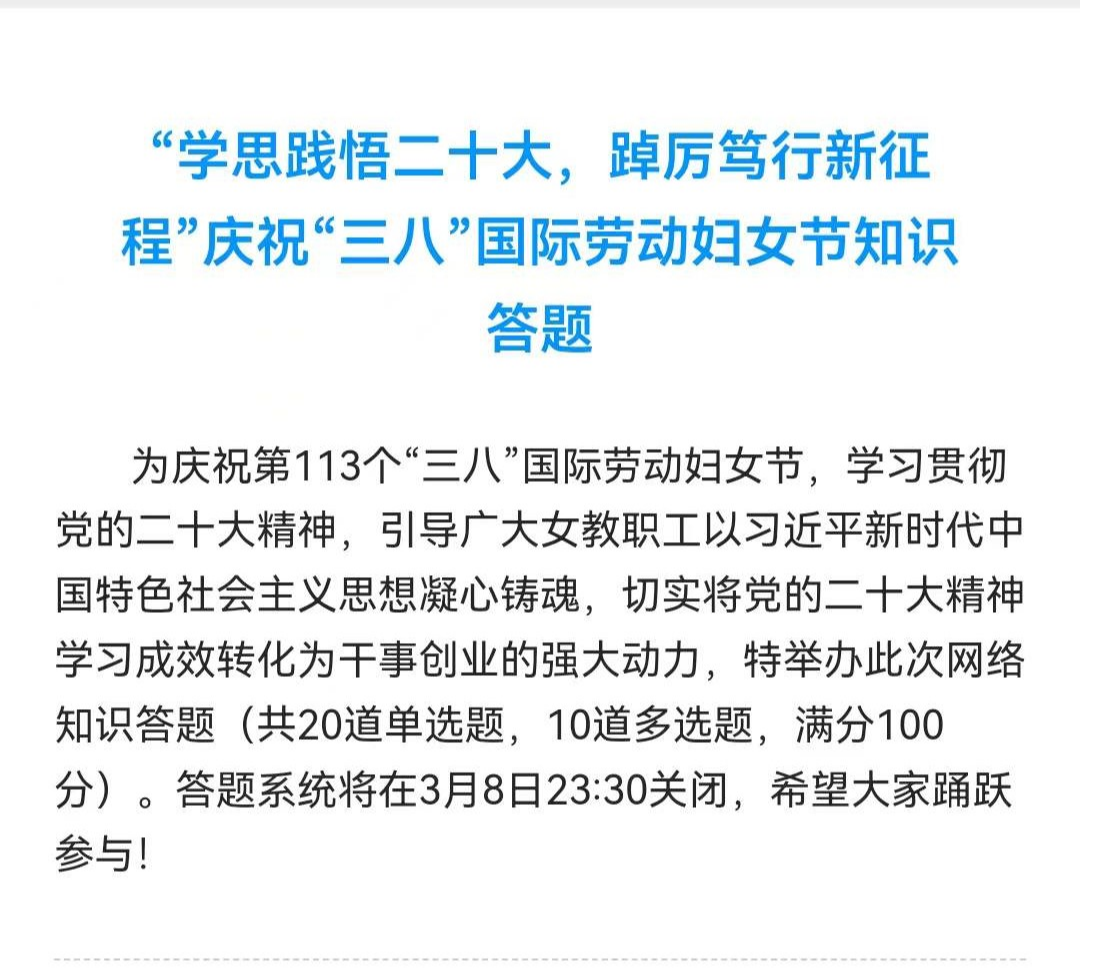 3月3日至3月8日,组织开展了以学习党的二十大精神为主要内容的线上答题活动,引导广大女教职工以习近平新时代中国特色社会主义思想凝心铸魂,切实将党的二十大精神学习成效转化为干事创业的强大动力,为学校高质量发展赋能聚力。