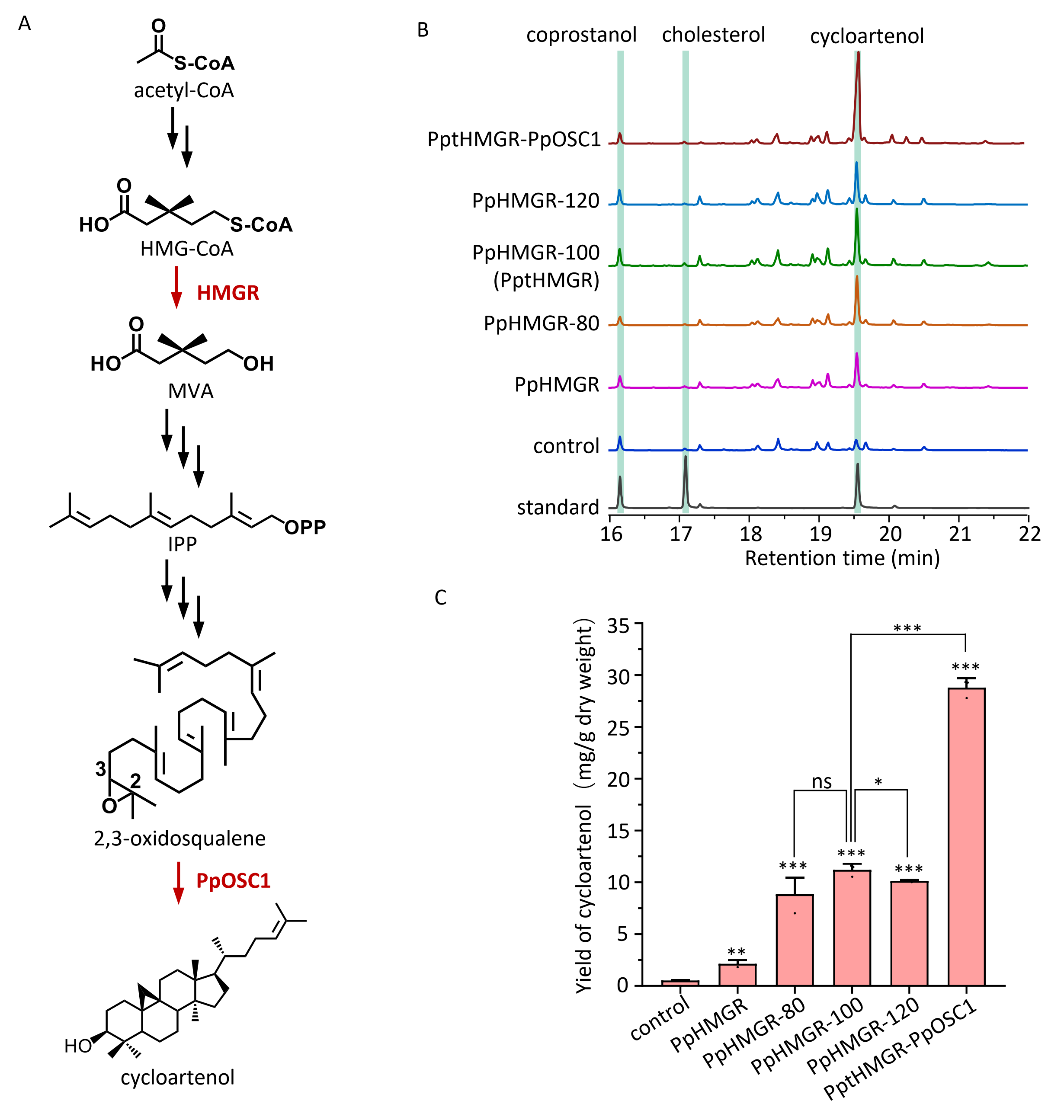 该文章利用根癌农杆菌介导的烟草瞬时表达技术和病毒诱导的基因沉默技术,采用逐步筛选的方法,从药用植物重楼中鉴定出九种酶:SSR1-3、SMO1-3、CPI-5、CYP51G、SMO2-2、C14-R-2、8,7SI-4、C5-SD1和7-DR1-1,成功破译了重楼中从环阿屯醇到胆固醇的详细生物合成代谢网络(图1),并进一步对甲羟戊酸途径的关键基因HMGR进行了优化,将其与PpOSC1基因在烟草叶片中共表达,使环阿屯醇的积累量达到28.79 mg/g干重,为胆固醇生物合成提供了充足的前体(图2)。随后,研究人员采用逐一去除的方式,发现其中六种酶:SSR1-3、SMO1-3、CPI-5、CYP51G、SMO2-2和C5-SD1对烟草中胆固醇的产率至关重要。以此,在烟草中建立了一个高效胆固醇合成系统,产率为5.63 mg/g干重,是野生型烟草产率的11.45倍。利用这一高效的胆固醇合成植物系统,进一步阐明了重楼中的薯蓣皂素形成的生物合成代谢网络,获得了2.12 mg/g干重的产量。这一研究为缺乏体内功能验证系统的药用植物代谢途径的表征提供了有效的策略,也为植物体内合成活性甾体皂苷奠定了基础。