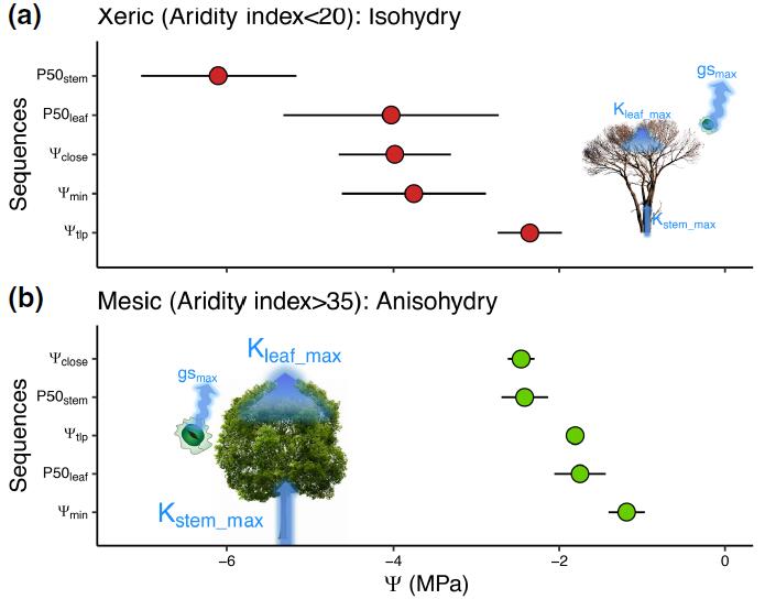 干旱和湿润地区的树木气孔关闭和水力功能失调的水势序列