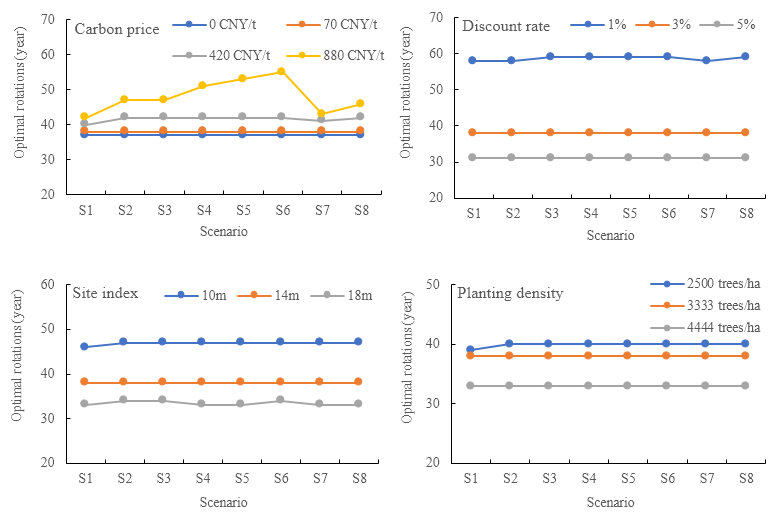 图2不同模拟情景对长白落叶松人工林最优轮伐期的影响