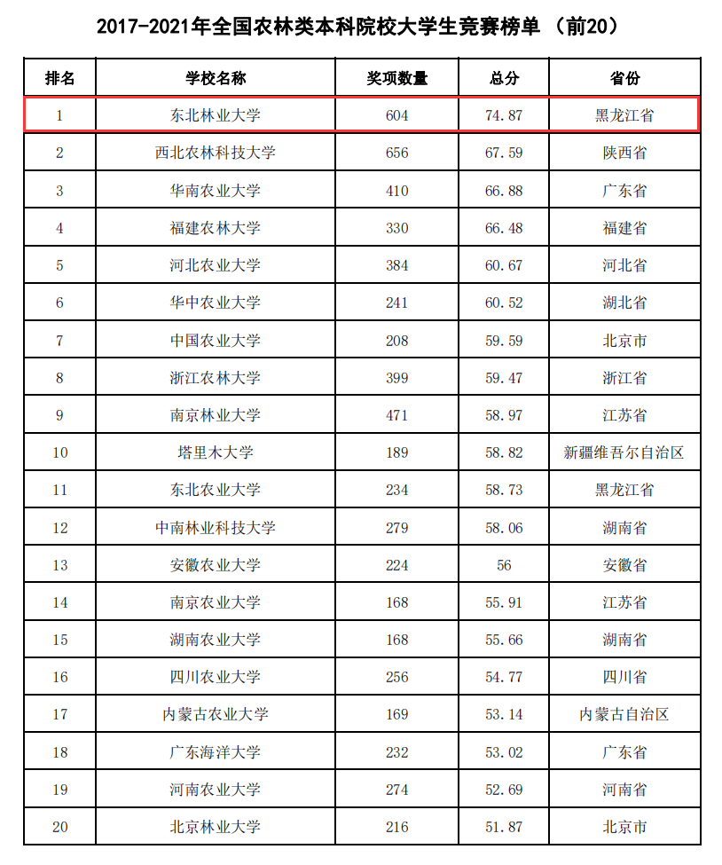 2月22日,中国高等教育学会高校竞赛评估与管理体系研究工作组发布2021全国普通高校大学生竞赛分析报告。我校在《2017-2021年农林类本科院校大学生竞赛排行榜TOP20》中,以总分74.87(获奖604项)的优异成绩,连续四年蝉联榜首。在2017-2021年本科榜单中,我校在全国本科高校中位居59位,是唯一一所进入前100的农林类高校,并且在“双一流”建设高校中位居49位(共144所)。