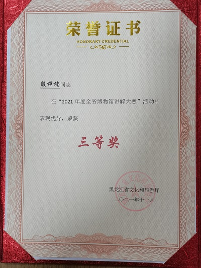 由黑龙江省文化和旅游厅主办,黑龙江艺术职业学院承办的黑龙江省博物馆讲解大赛公布比赛结果,中国(哈尔滨)森林博物馆讲解员殷梓楠在比赛中荣获三等奖。