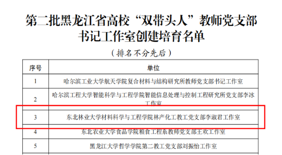 近日,黑龙江省委教育工委公布了第二批黑龙江省高校党建工作标杆院系、样板支部、“双带头人”教师党支部书记工作室和首批“研究生样板党支部”创建培育名单。我校野生动物与自然保护地学院党委、机电工程学院晨曦公益党支部、马克思主义学院塞罕坝精神研究会党支部、机关团委党支部、材料科学与工程学院林产化工教工党支部李淑君工作室、机电工程学院博士研究生党支部、材料科学与工程学院生态科研与创新实践党支部等七个党组织均在建设名单之列。
