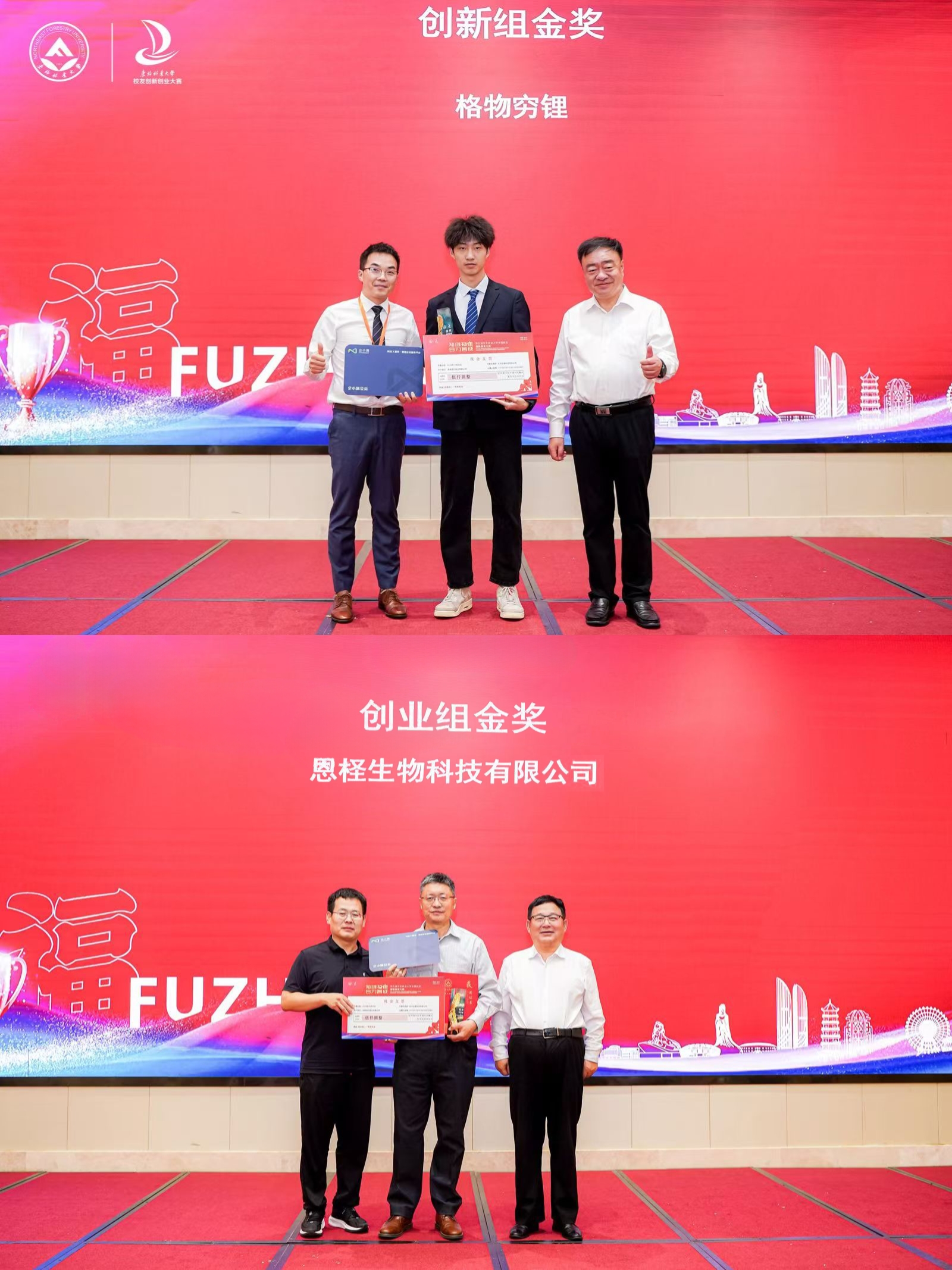 第五届校友创新创业大赛中,学校领导为获得创新组和创业组金奖的校友颁奖