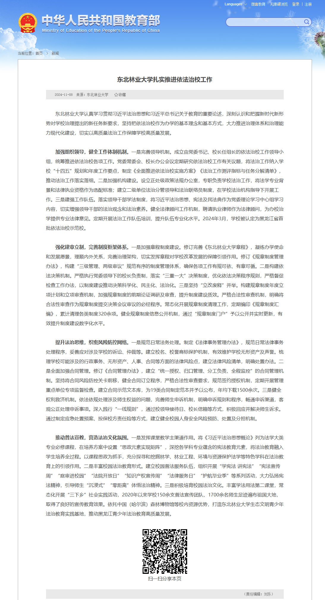 学校持续完善现代大学治理体系,健全以章程为核心的制度体系,《星空游戏免费版下载章程修正案》获教育部核准。出台《星空游戏免费版下载规章制度管理办法》,加强规章制度“废、改、立、释”工作,进一步规范制度管理。制定《星空游戏免费版下载全面推进依法治校实施方案》,推出“依法治校33条”,学校获批黑龙江省首批依法治校示范校。