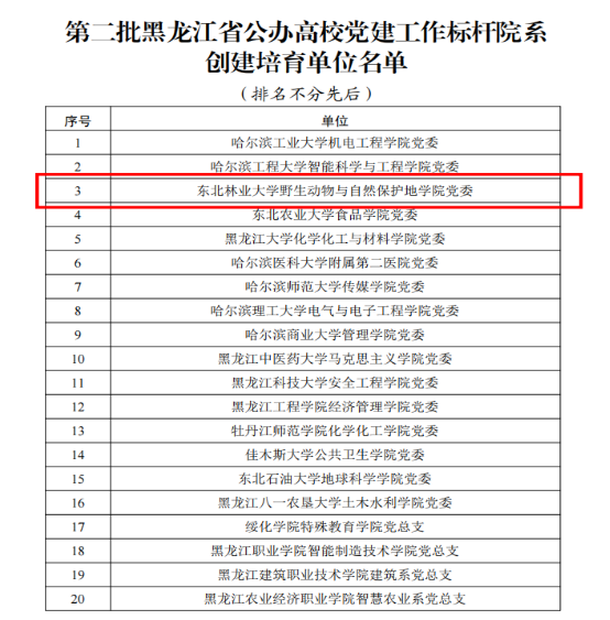 近日,黑龙江省委教育工委公布了第二批黑龙江省高校党建工作标杆院系、样板支部、“双带头人”教师党支部书记工作室和首批“研究生样板党支部”创建培育名单。我校野生动物与自然保护地学院党委、机电工程学院晨曦公益党支部、马克思主义学院塞罕坝精神研究会党支部、机关团委党支部、材料科学与工程学院林产化工教工党支部李淑君工作室、机电工程学院博士研究生党支部、材料科学与工程学院生态科研与创新实践党支部等七个党组织均在建设名单之列。