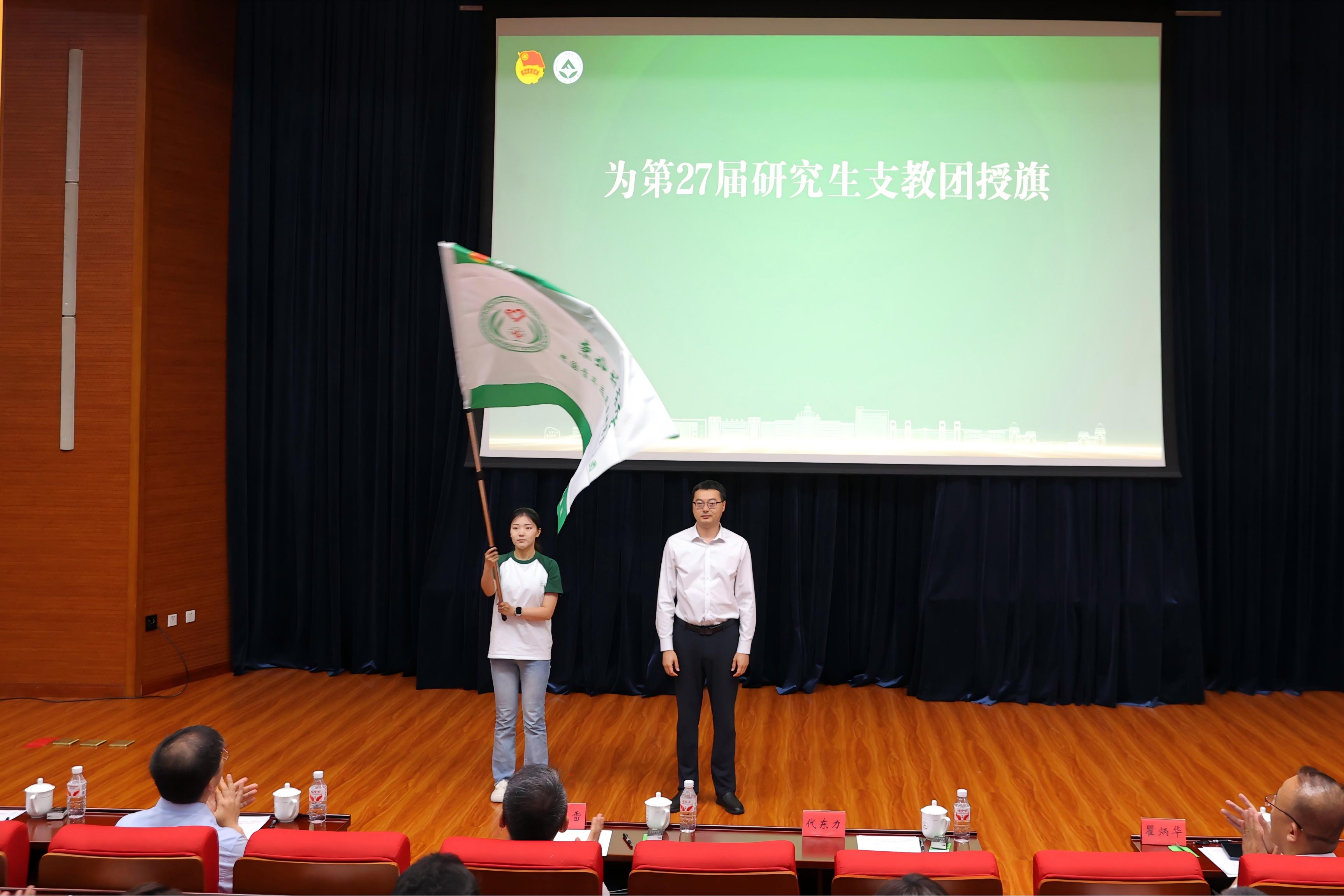代东力为学校第27届研究生支教团授旗。张春雷从“争做理想信念的坚定信仰者”“争做东林精神的接续传承者”“争做一往无前的时代奋斗者”三个方面,勉励全体西部计划志愿者生动践行“青春为中国式现代化挺膺担当”的誓言,让东林之花在祖国西部绚丽绽放。