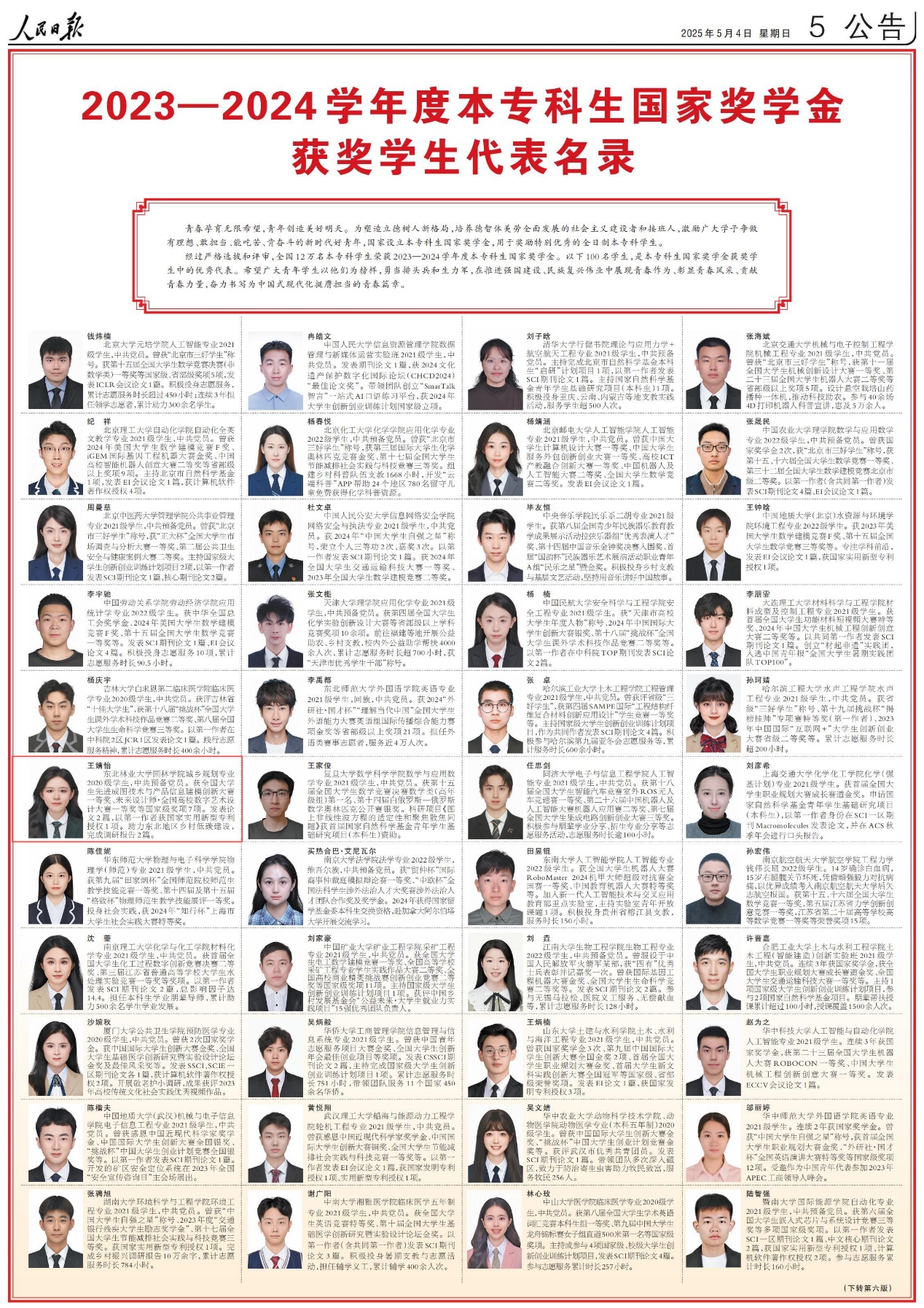 据了解,全国共有12万名本专科学生、9万名研究生荣获2023—2024学年度国家奖学金。经过严格选拔和评审,人民日报选出100名本专科生、100名研究生优秀代表刊发名录。