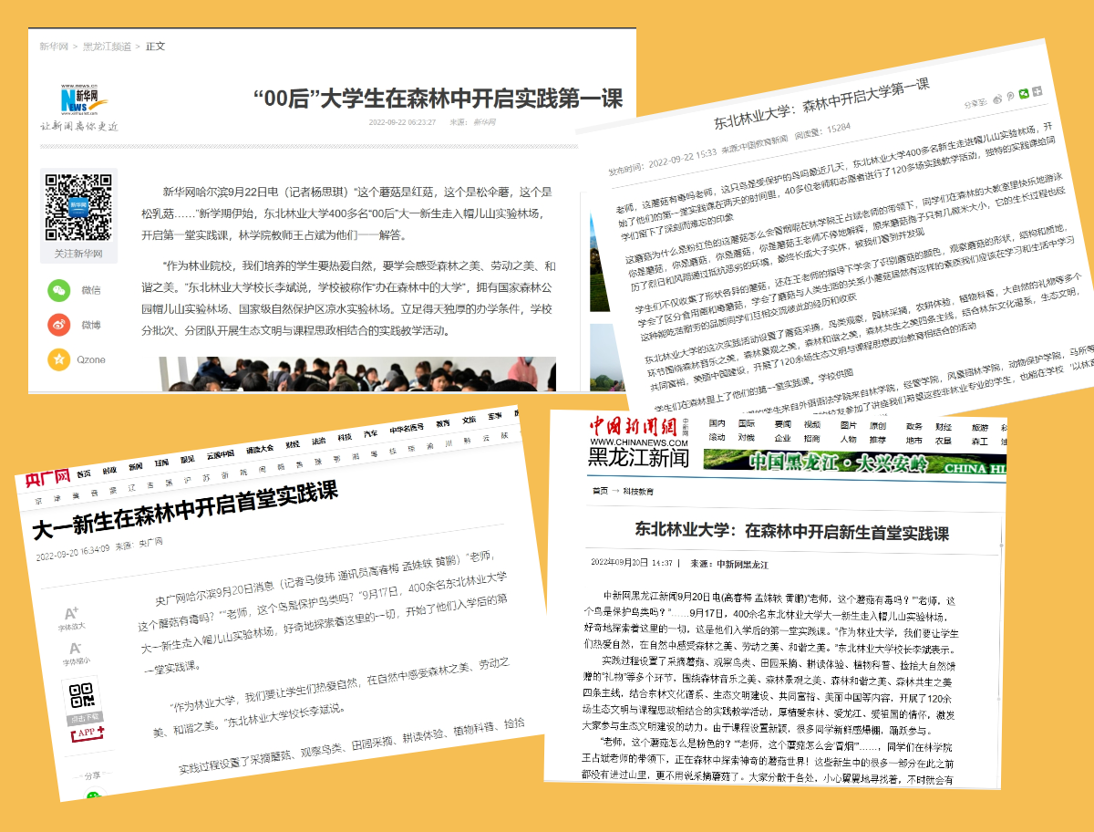 学校依托拥有的帽儿山实验林场、凉水实验林场、森林博物馆等得天独厚的“自然大课堂”,开展浸润式实践,设置“森林之美与美丽中国”等35项特色实践项目,包括采摘蘑菇、观察鸟类、田园采摘、耕读体验、植物科普、捡拾大自然馈赠的“礼物”等多个环节,同学们在老师的带领下,围绕森林音乐之美、森林景观之美、森林和谐之美、森林共生之美四条主线,结合东林文化谱系、生态文明建设、共同富裕、美丽中国等内容,开展多场生态文明与课程思政相结合的实践教学活动,厚植爱东林、爱龙江、爱祖国的情怀,激发大家参与生态文明建设的动力。